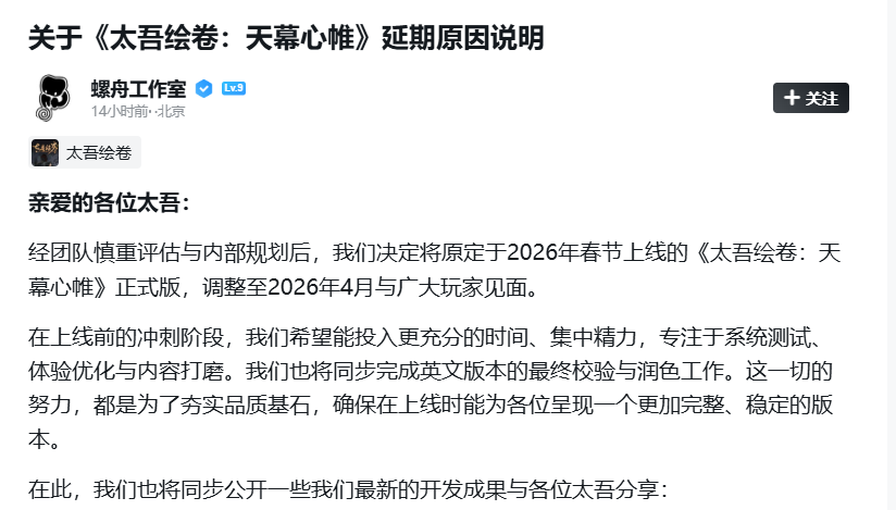 今日,《太吾绘卷》官方宣布,原定于2026年春节上线的《太吾绘卷:天幕心帷》正式版,将延期至2026年4月推出。官方表示,为保障品质,团队需投入更多时间进行系统测试、体验优化与内容打磨,同步完成英文版本的最终校验润色,确保上线版本完整稳定。