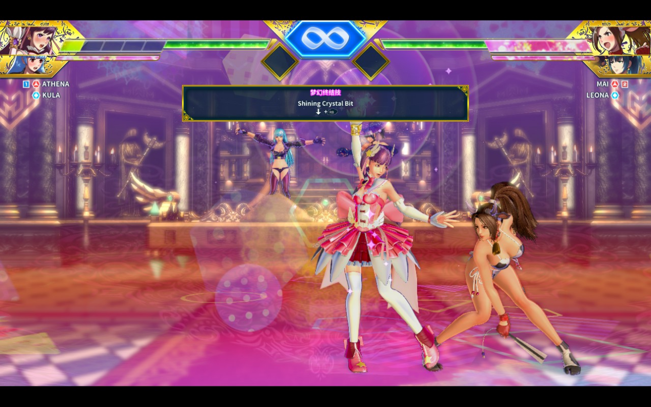 本作在2018年登陆PS4和Switch的主机平台,在2019年登陆Steam平台,云集了SNK各种格斗游戏的角色,雅典娜、库拉、不知火舞、夏尔米、娜可露露、坂崎由莉等高人气老资历自不必说,连拳皇14的新角色瑟琳娜、希尔薇、蜜蜜、恋心、美杏和梁师娘都有,还有娘化特瑞特瑞儿。