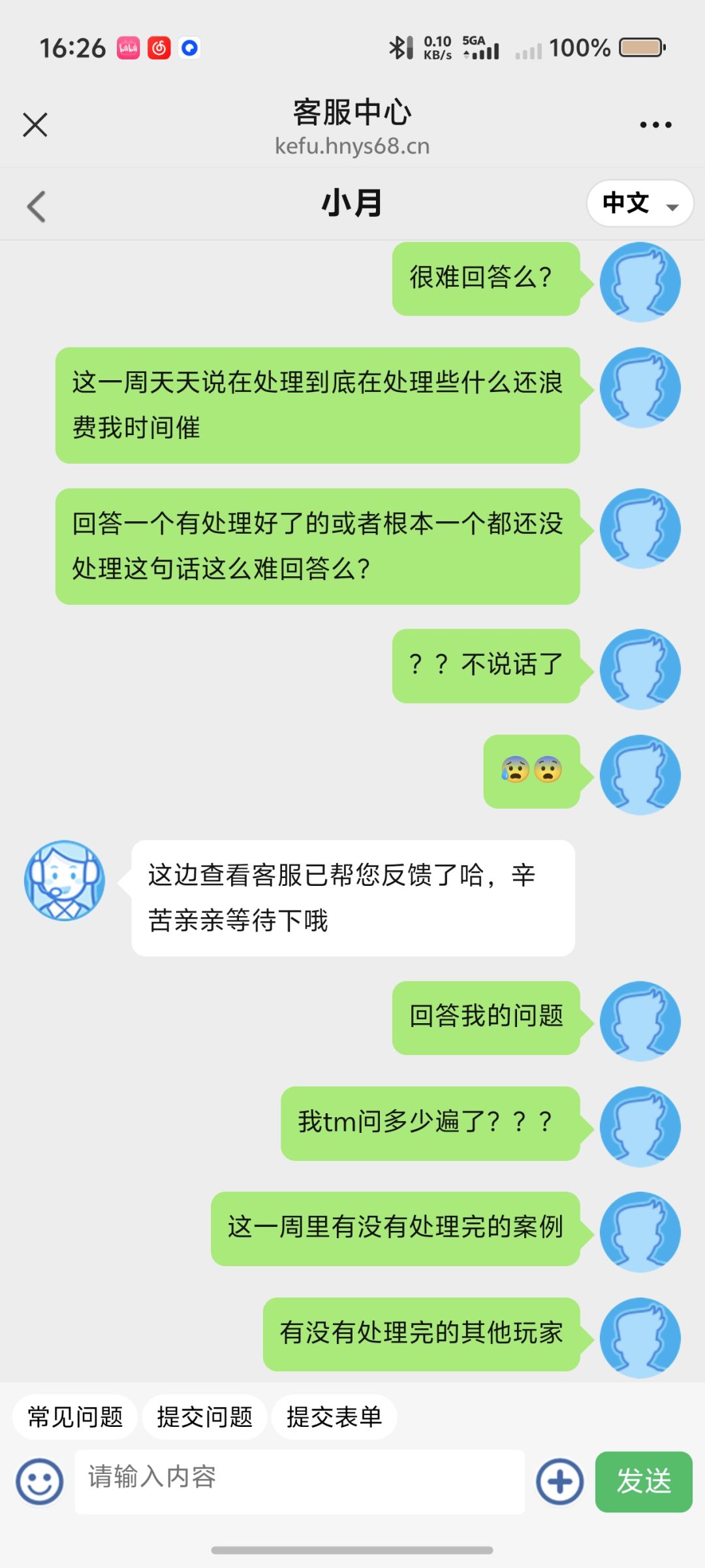催了一周每次都同样的回复让我等,一点进度都没看见,问他处理了一周到底有没有处理好的其他玩家完全不回复