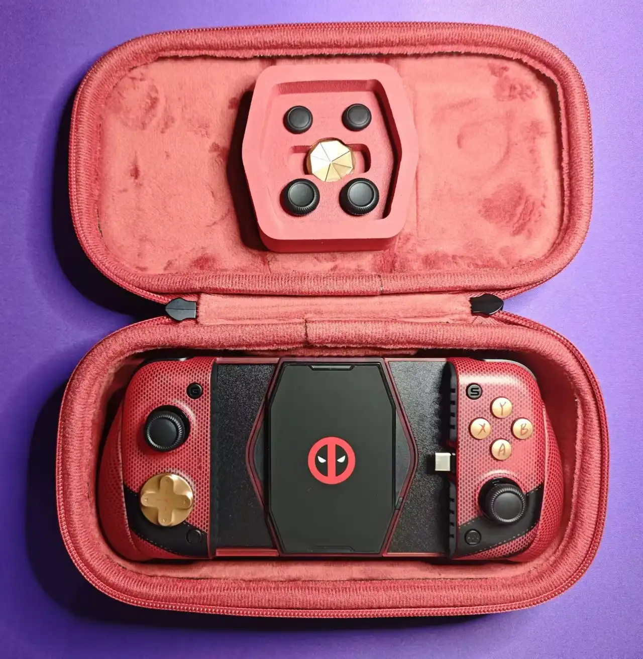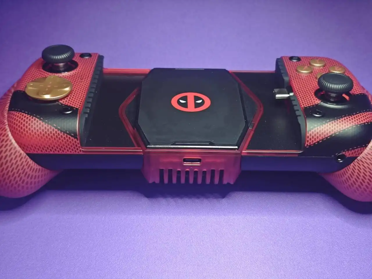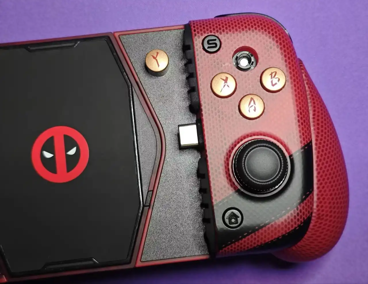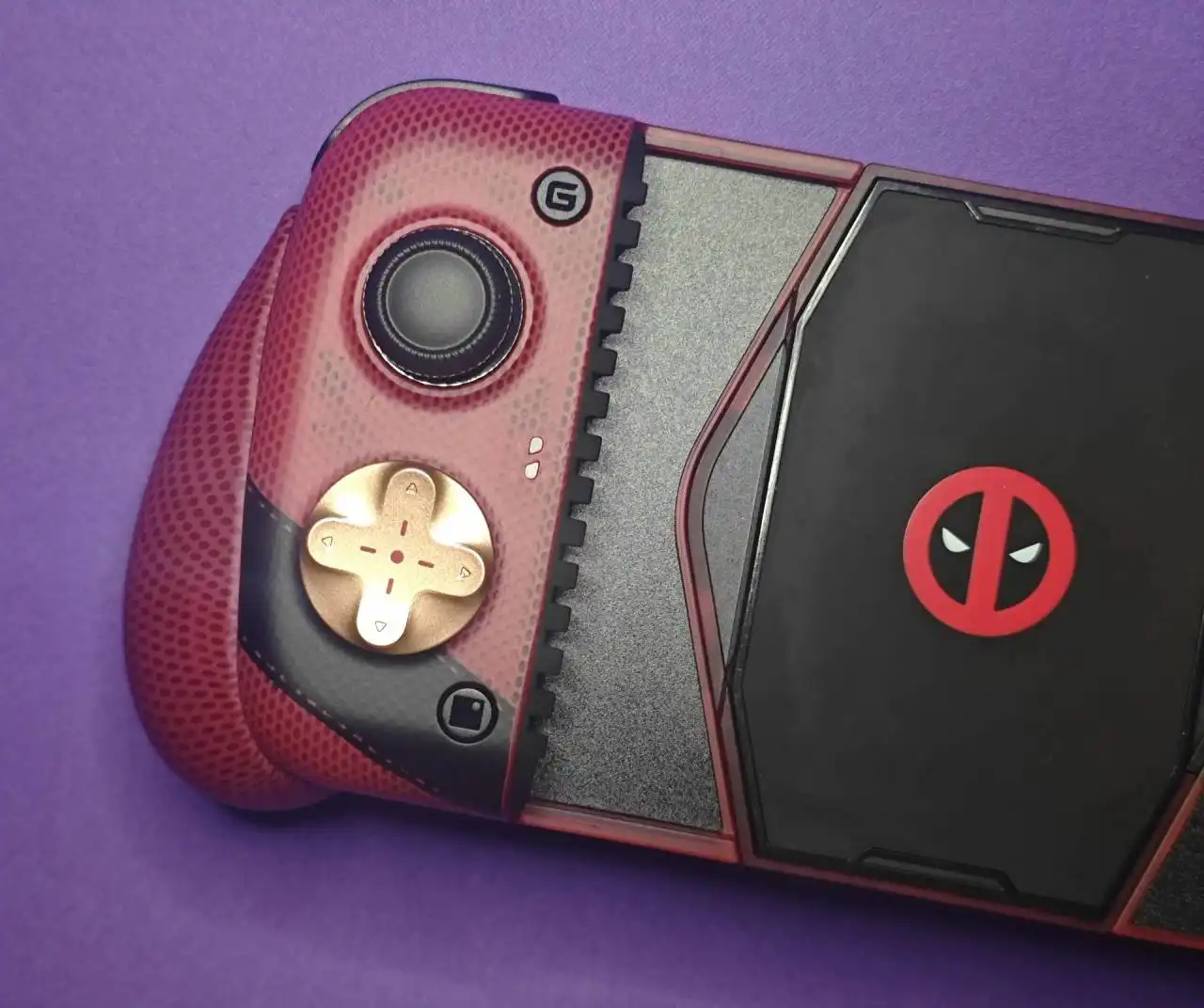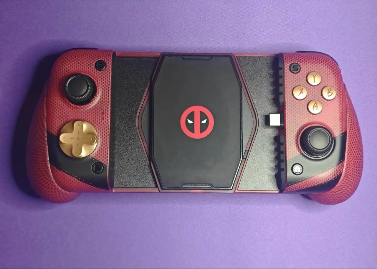 但是这次我真的要夸一下小鸡,X3PRO死侍联名款设计的是真帅,在我看来完全不输于之前微软做的死侍和金刚狼的联名手柄(属于是两种不同的帅了),毕竟拉伸手柄一般在需要拉长的情况下中间部分都会显得特别突兀,但是X3PRO却没有一丁点的这种感觉,反而在没有插入手机的情况下显得更帅了。