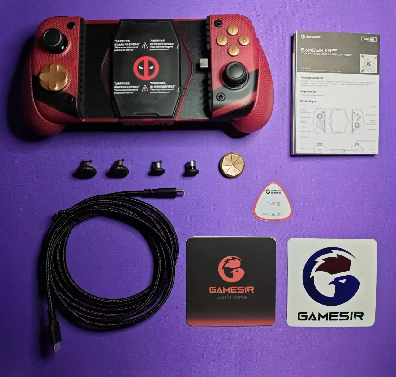 盖世小鸡X3PRO不管是原版还是联名款,都是自带手柄包的,但是联名款手柄包因为配色和中间的死侍标志,比原版帅的可不是一点半点~