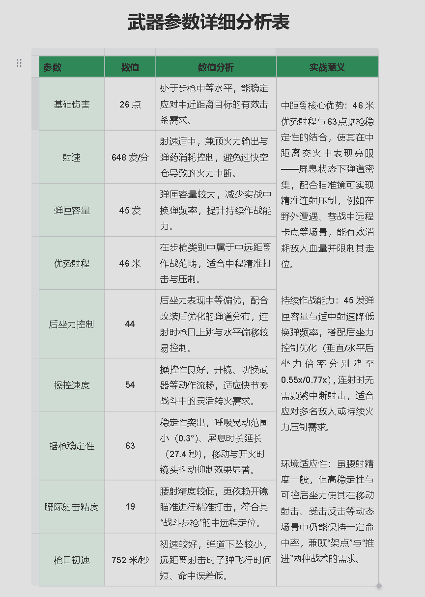 从数据种可以得出:改装M7战斗步枪是一把以中距离精准压制为核心优势的枪械,凭借高据枪稳定性、可控后坐力与较大弹匣容量,在中程交火中展现出优秀的持续输出与弹道精度。其设计兼顾稳定性与操控性,适合注重“精准连射”与“中距离火力支援”的玩家,能胜任野外遭遇、据点攻防等多种场景。尽管近距离腰射与超远程狙击能力存在局限,但在其定位范围内,是一把综合性能均衡、实战价值突出的战术武器,尤其适合需要稳定输出与战术压制的团队作战环境。