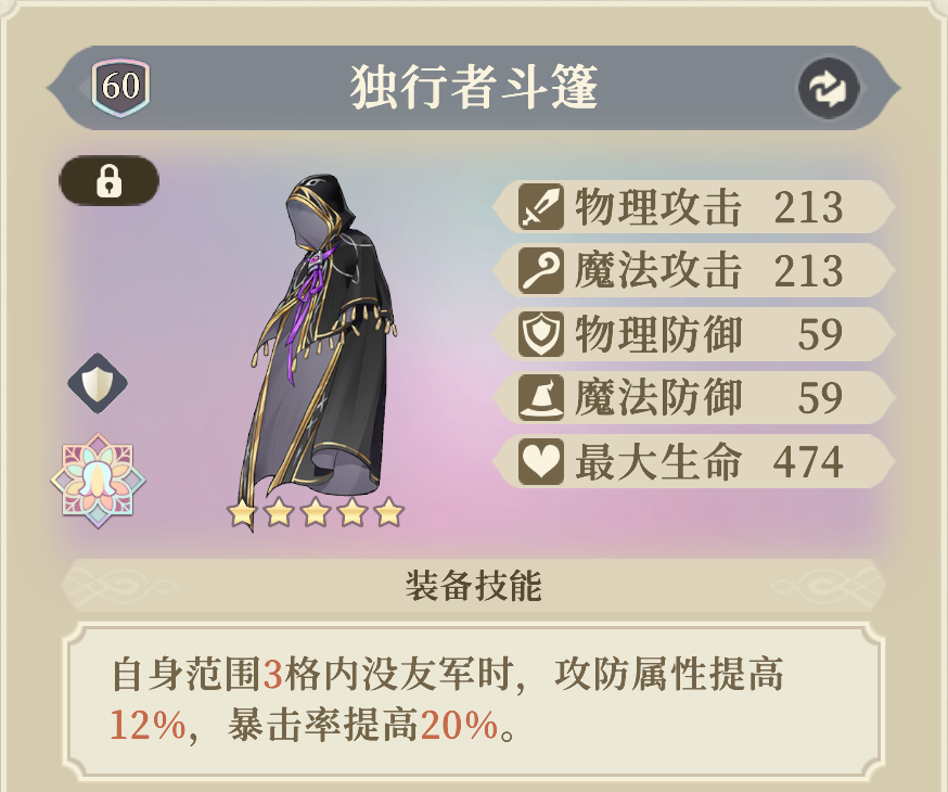 - 除了独行者斗篷外,还可以用诡诈之影/原时沙漏/精准表尺/守护正义之盾等装具来实现提高攻防属性的功能。