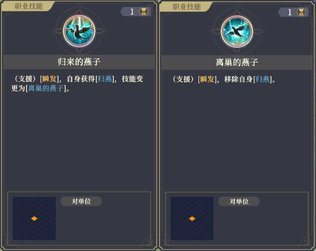 - 瞬发技能,使用后获得[归燕],效果:物理攻击后降低目标速度,行动结束时传回队友身边,并回复生命与能量。使用后,技能转换为“离巢的燕子”。