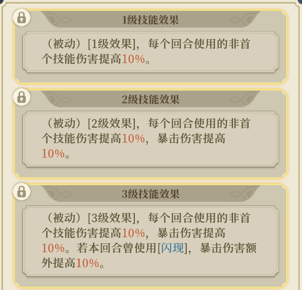 - 回合内使用非首个技能时伤害、暴击伤害提高;使用[闪现]后,自身暴击伤害额外提高。