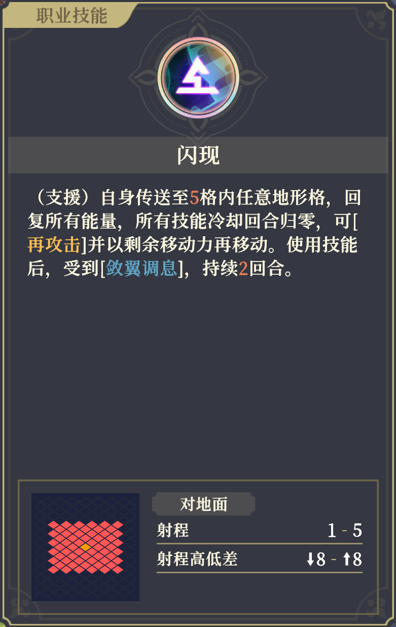 ✦ 以非[待机]的方式结束行动时,若无[敛翼调息],则可使用技能[闪现],每回合限1次。