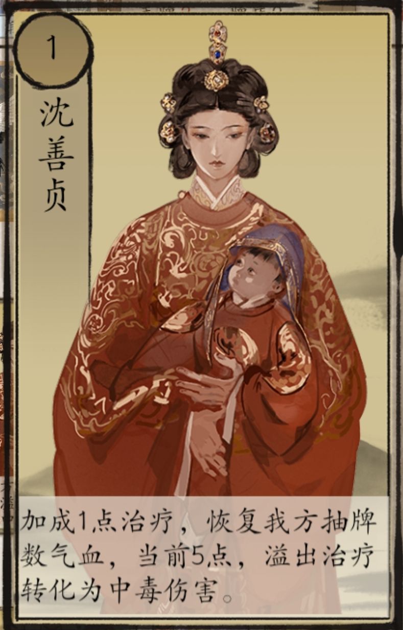 1、昭悼夫人沈善贞上线,技能为饮恨吞声:1费,回复我方抽牌数气血,若溢出生命上限,则转化为中毒,使用后重置。在卡组时,我方回合加成1点治疗。