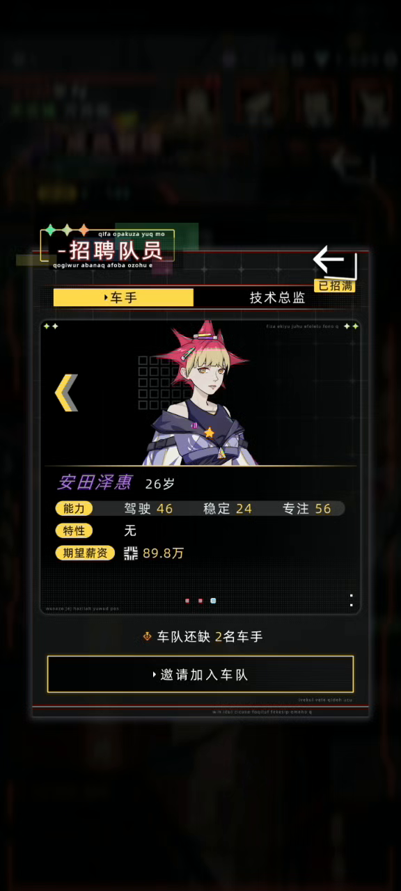 4️⃣、技术总监:选择一个年龄小,属性较高的招募培养,技术总监需要长期培养,设计能力影响出图纸的时间,维修能力影响这对比赛中维修花费的时间。选择年龄小的,防止培养到一半员工老死了。