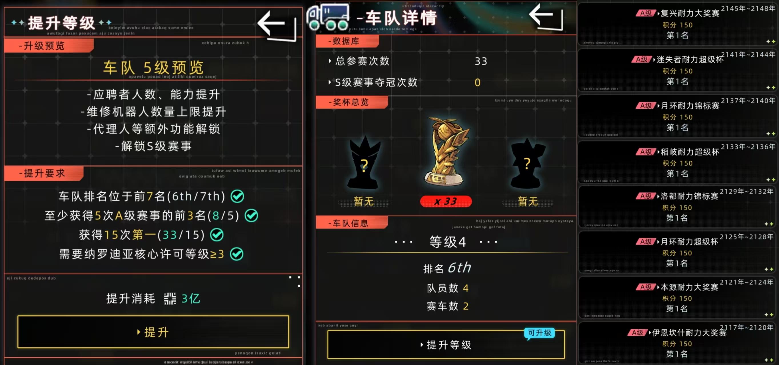 注:车队升级后需下一次比赛才能参加A级赛事,且A赛事有2个赛程。最快完成该条款需19年。