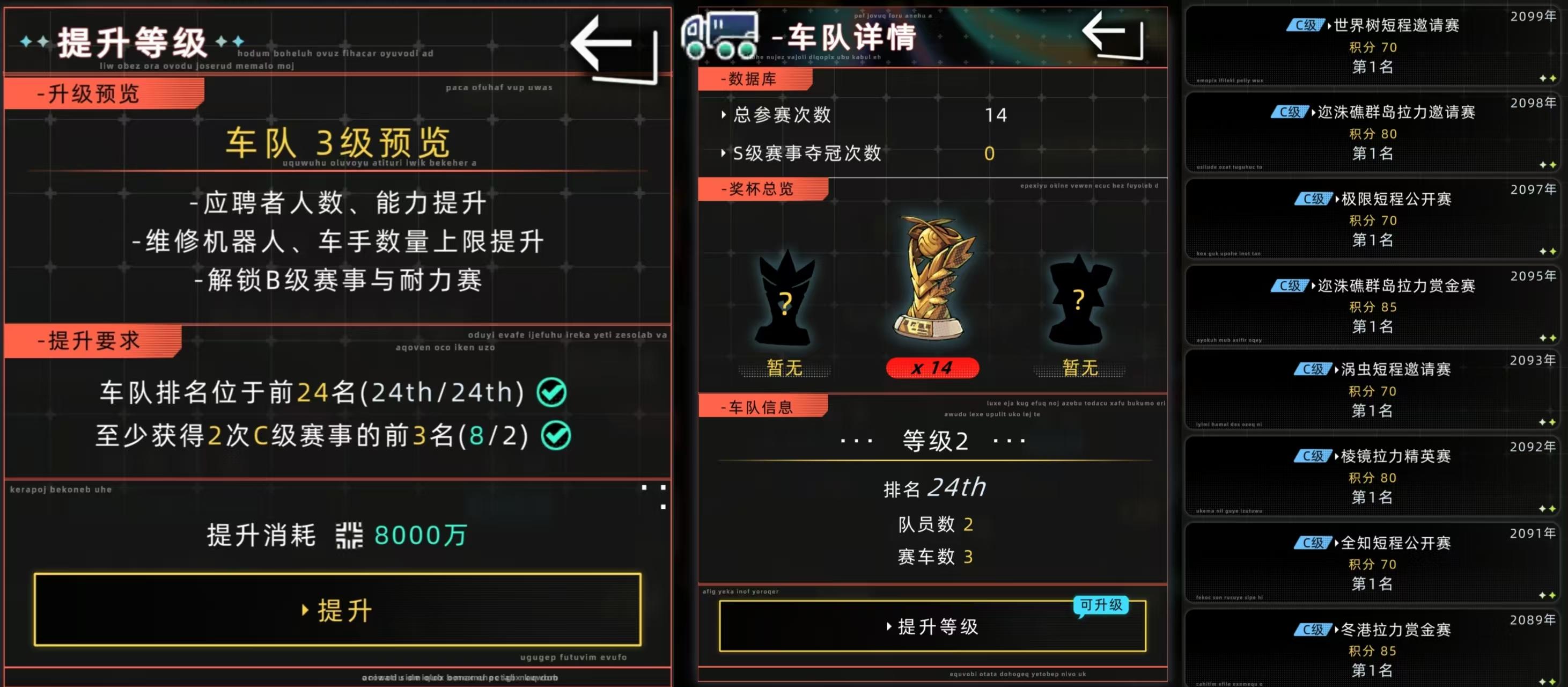 2️⃣、车队二级升三级,需完成C比赛8次,大致需要610积分(C赛事全第一)