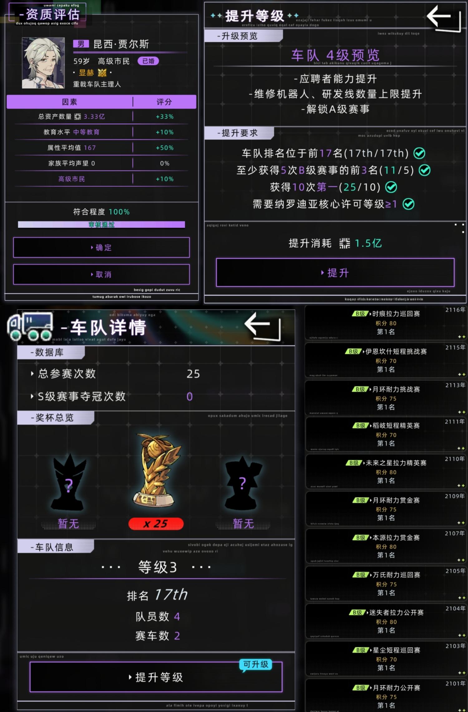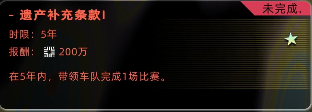 注:车队升级后需等下一次比赛才能参加B级赛事,最快完成该条款需12年。