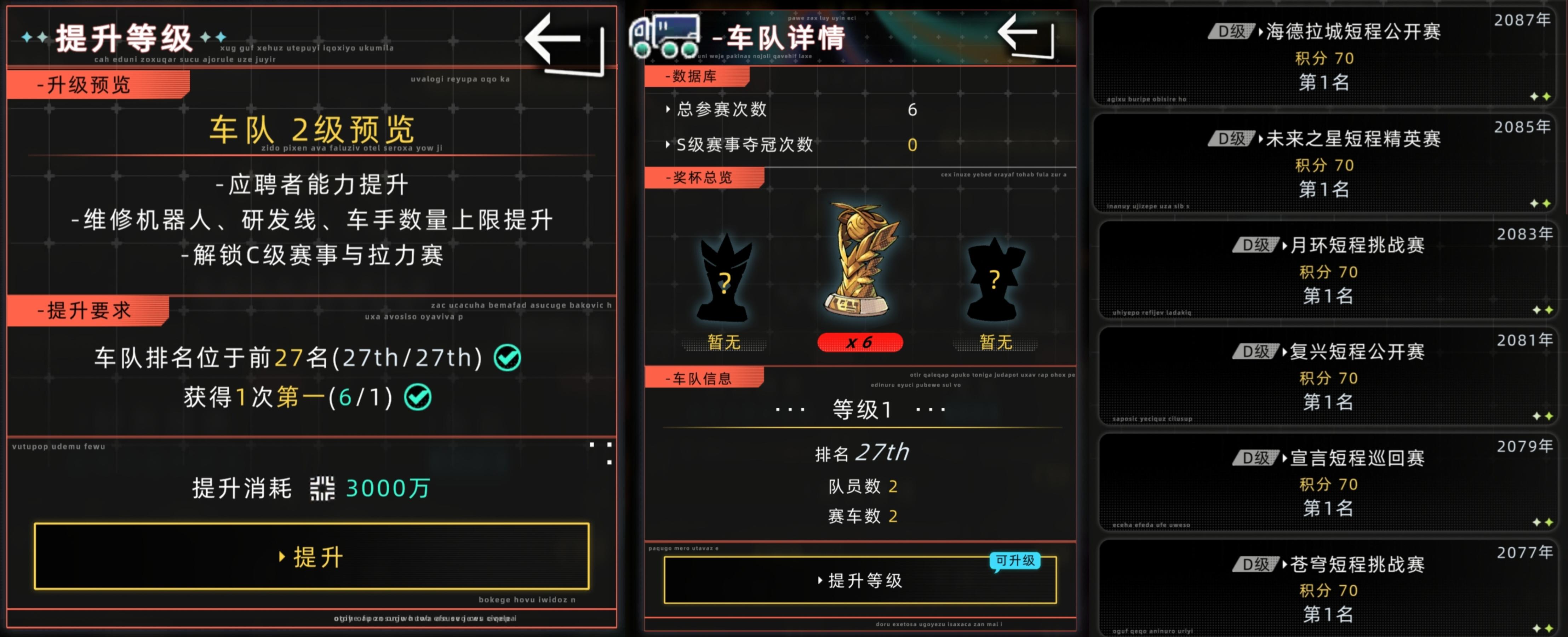 1️⃣、车队一级升二级,需完成D比赛6次,大致需要420积分(D赛事全第一)