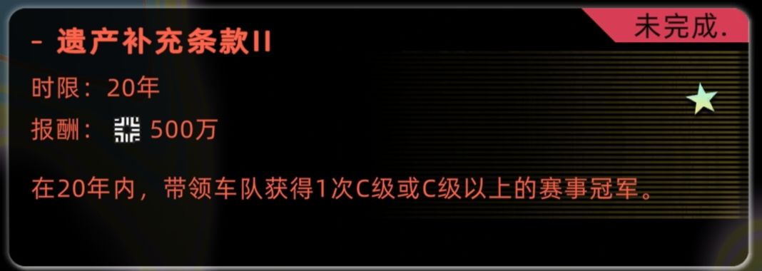 注:车队升级后需等下一次比赛才能参加C级赛事,最快完成该条款需12年。