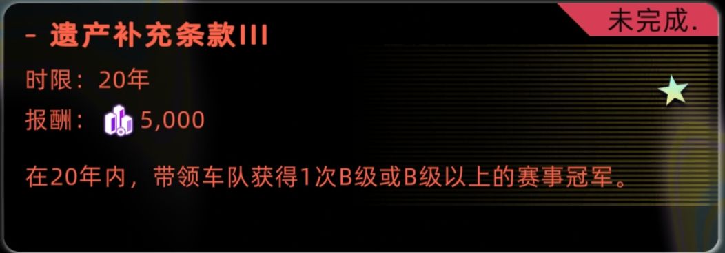 注:车队升级后需等下一次比赛才能参加B级赛事,最快完成该条款需12年。