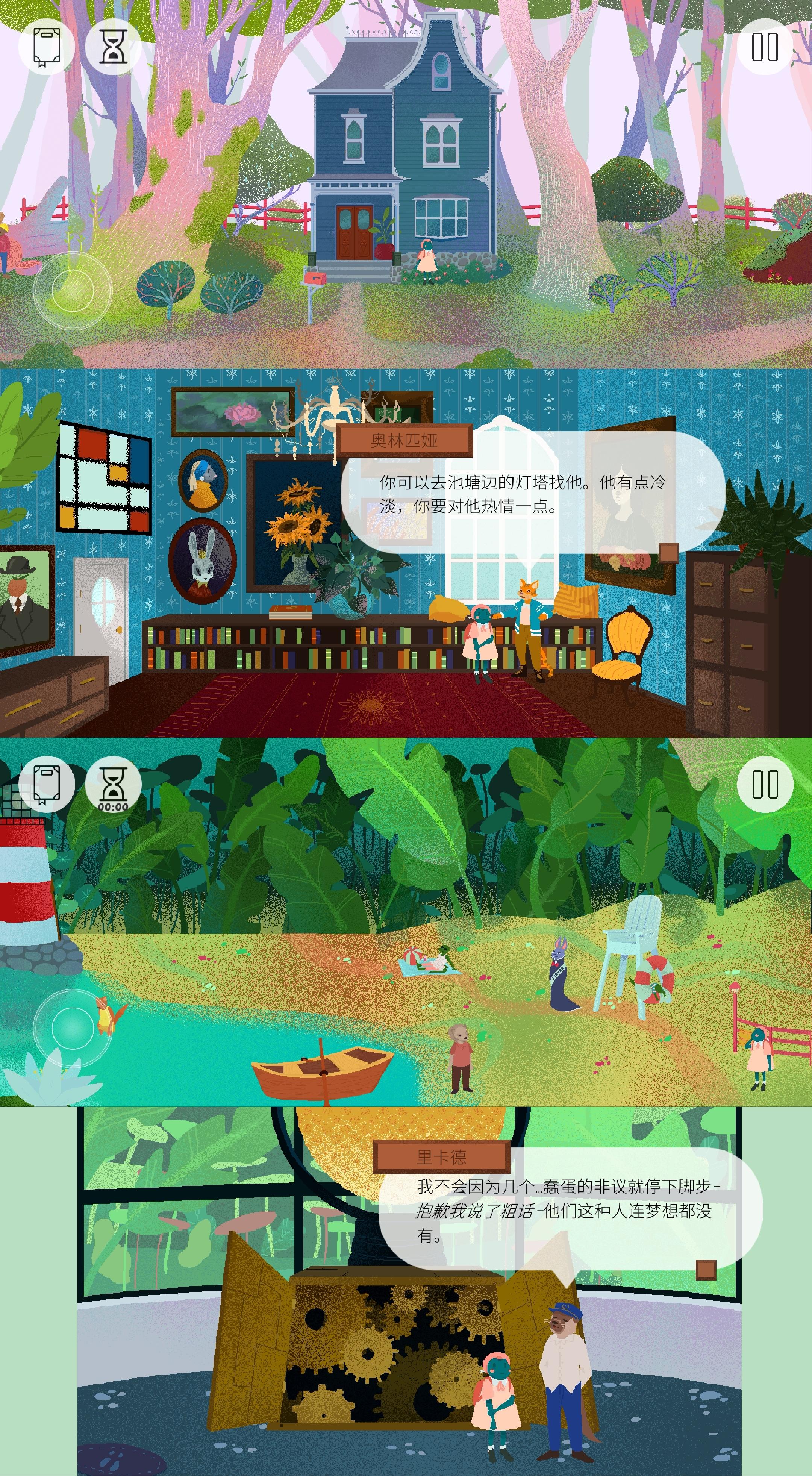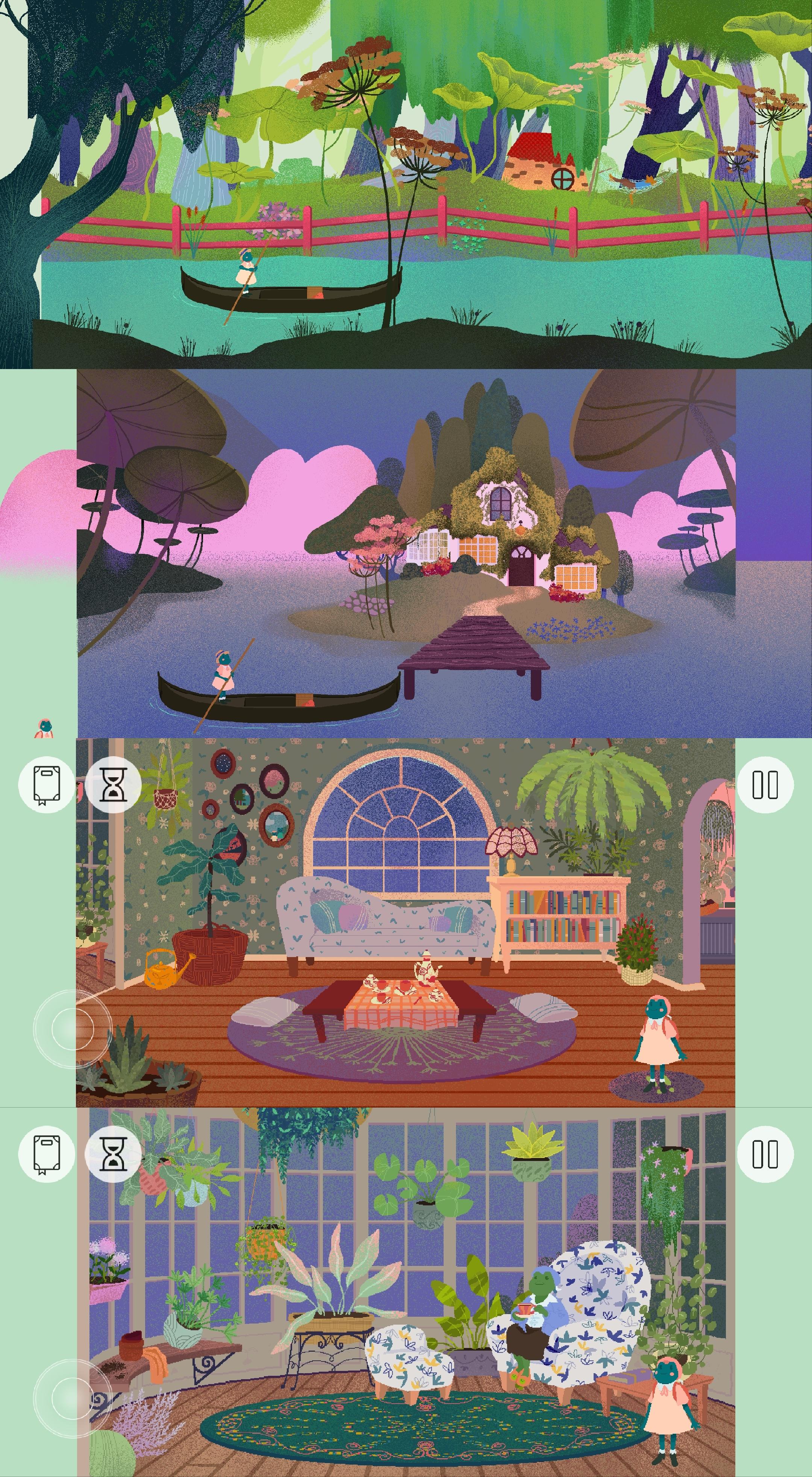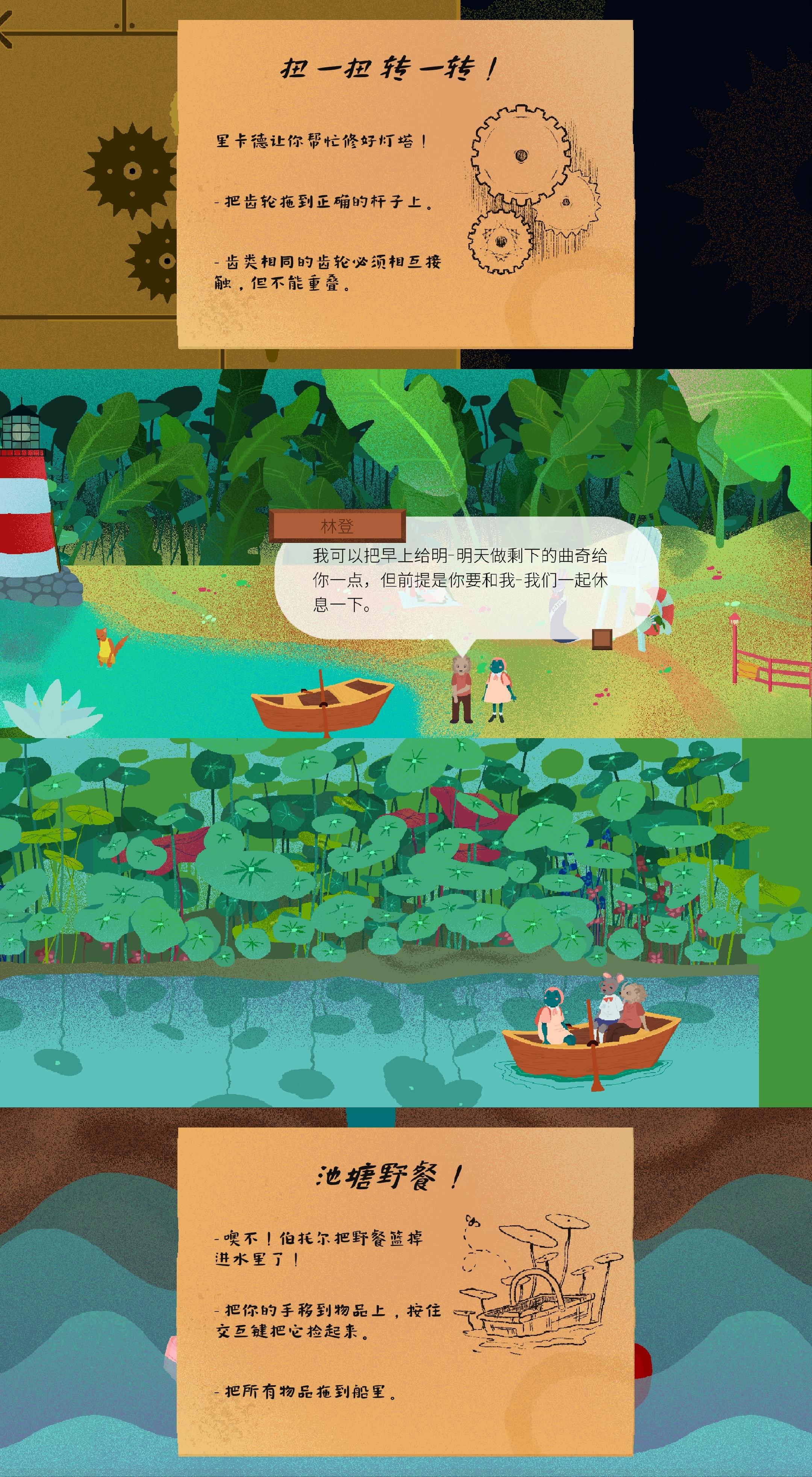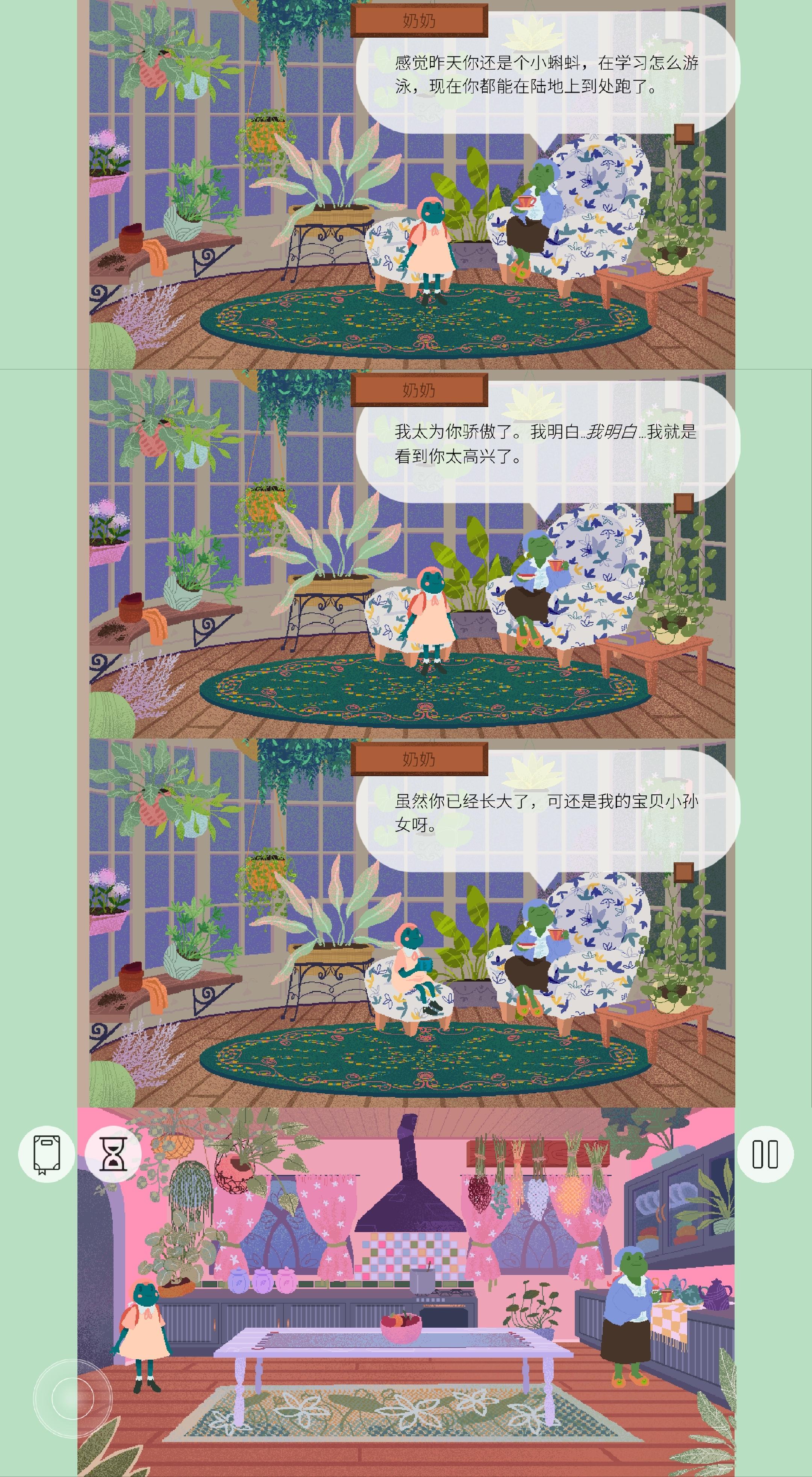 游戏氛围轻松愉悦,玩家可以操纵小青蛙随意行走、交流;游戏难度也不大,需要通关果蔬方块摆放、游泳比赛、邮票拼图、池塘捞物、齿轮摆放、物品寻找、飞毯下落、咖啡派送、演出动作记忆、茶品制作等小游戏,整体简单轻松、丰富有趣。
