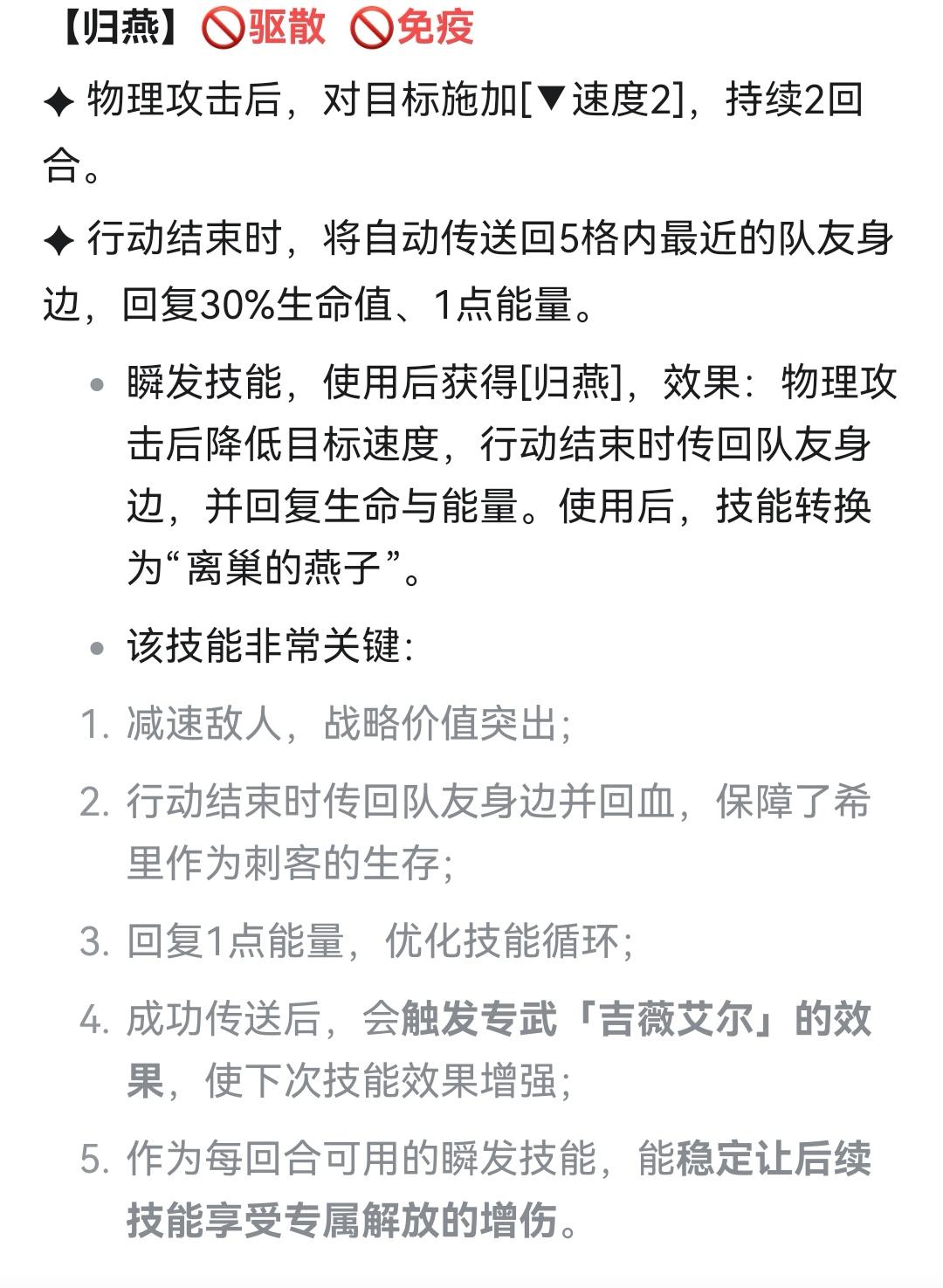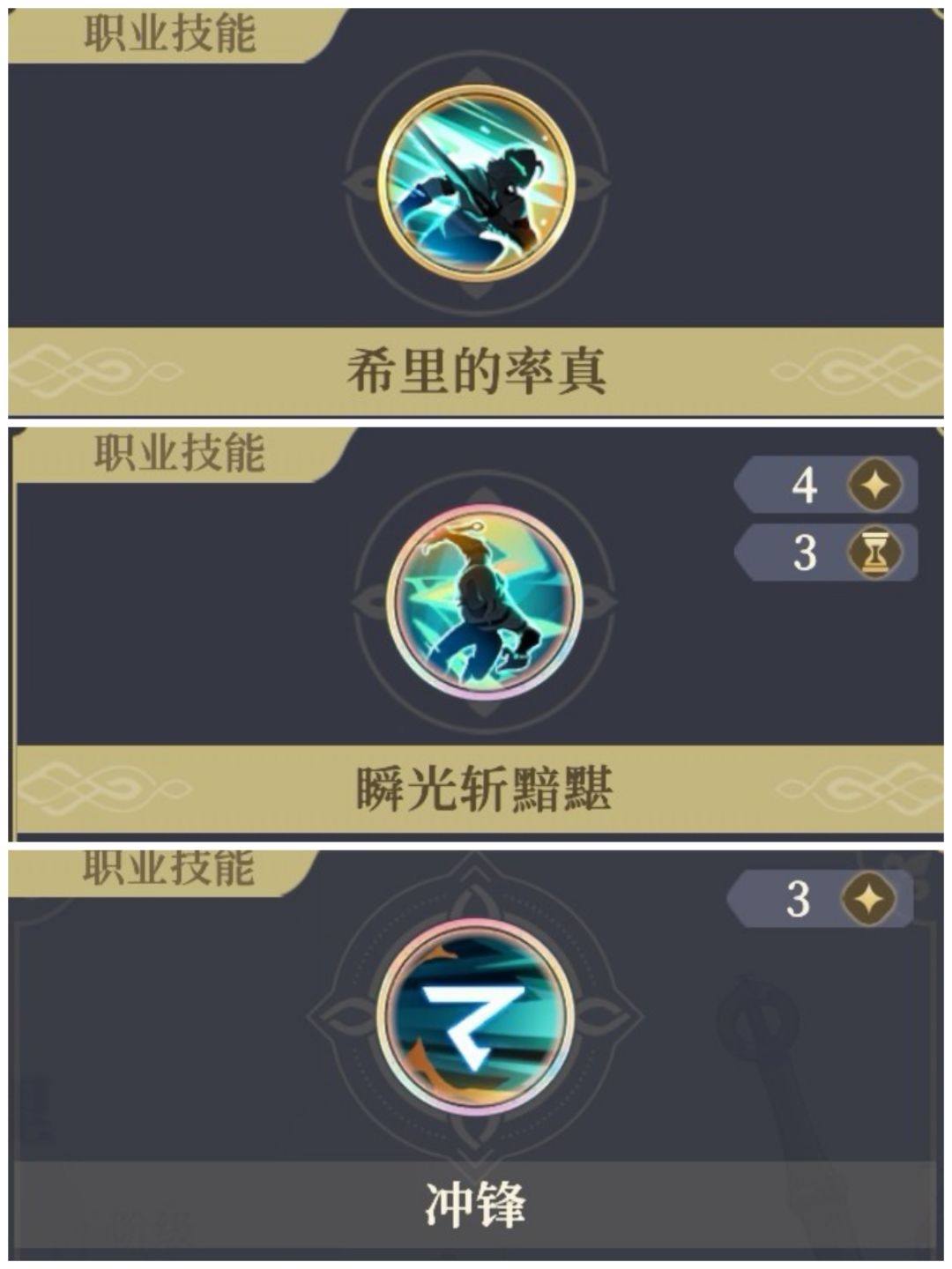 希里第一回合就可以直接1.8倍攻的大招起手,闪现回满能后接第二个1.8倍攻的大招(有专武第二发大招吃到增伤),第二回合普攻。用战旗就可以让希里第三回合开始循环。而且有杰洛特先上失衡可以让希里每次攻击都是必爆,冲锋也可以换成归燕好像能提高大量输出。(归燕的增伤可以看下超级缪缪的希里攻略)