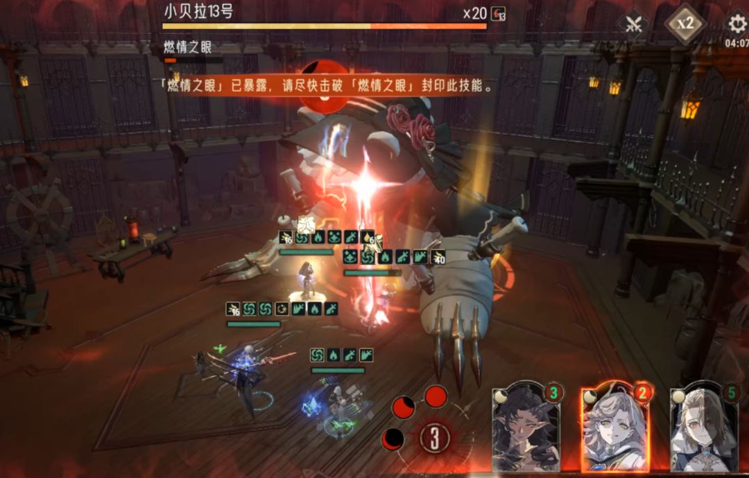 此后看一下BOSS血量,如果是18血条半血以下,就攒一波费用,如果是半血以上,就用提丰修一下BOSS血量。在BOSS进入17血条前,用阿卡贝拉使用奥义,往日的贝拉附身赛莉妮娅(下文简称为双贝前置动作,一方面可提供加成,一方面可预备好血月)。