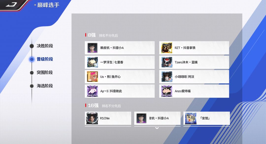 赛场高能扎堆,精彩说不完!小可在这里也要恭喜赖皮杭·抖音小A、Ap丶S|故此、Us·熊︱鱼开心、Anzo爱持福强势晋级8强!后续赛事更有看头,快来评论区为心仪的选手加油呀!