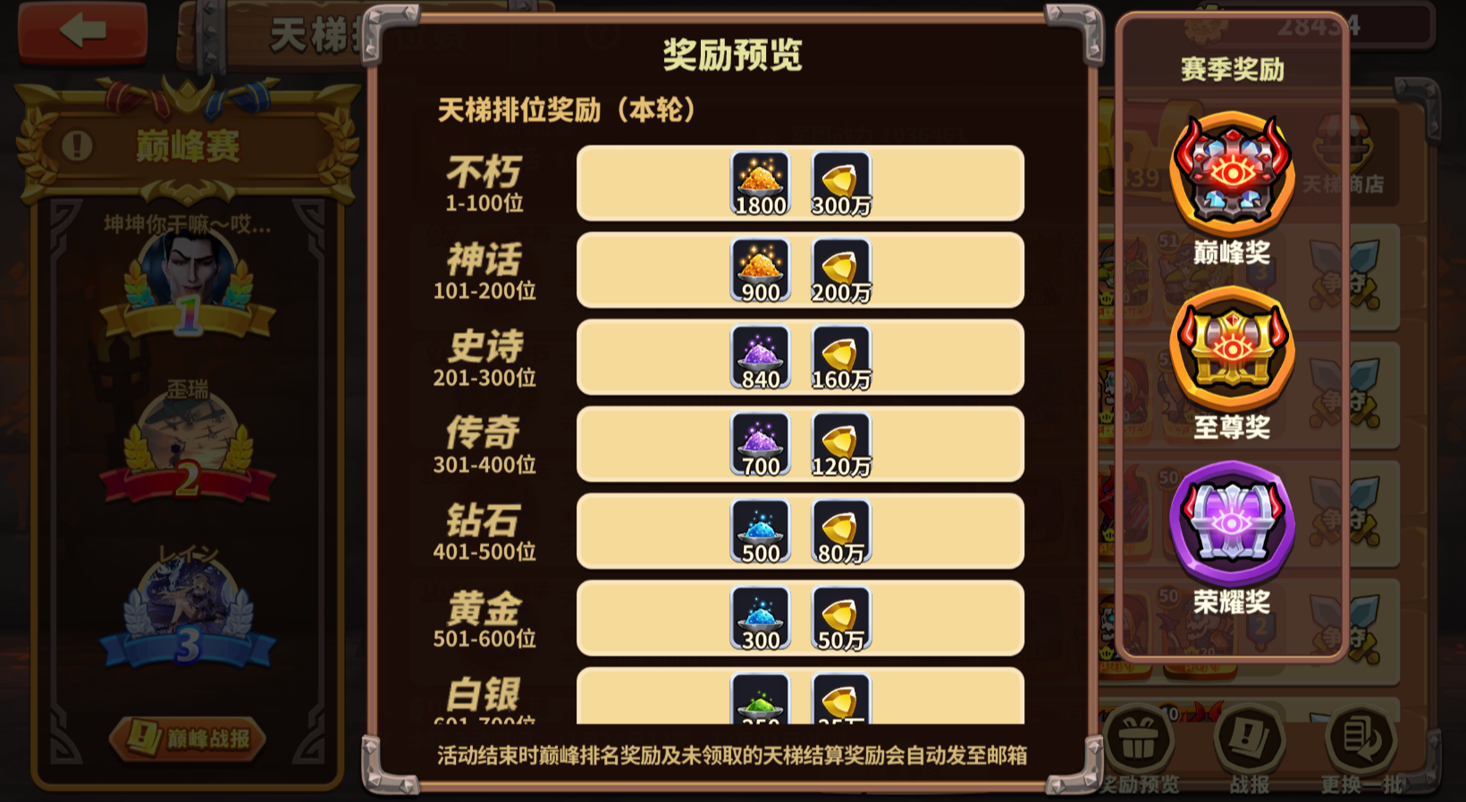 竞技场天梯排位赛右下角有奖励预览,由于每周一早晨六点结算,一定不要在结算前让自己的排名掉下去