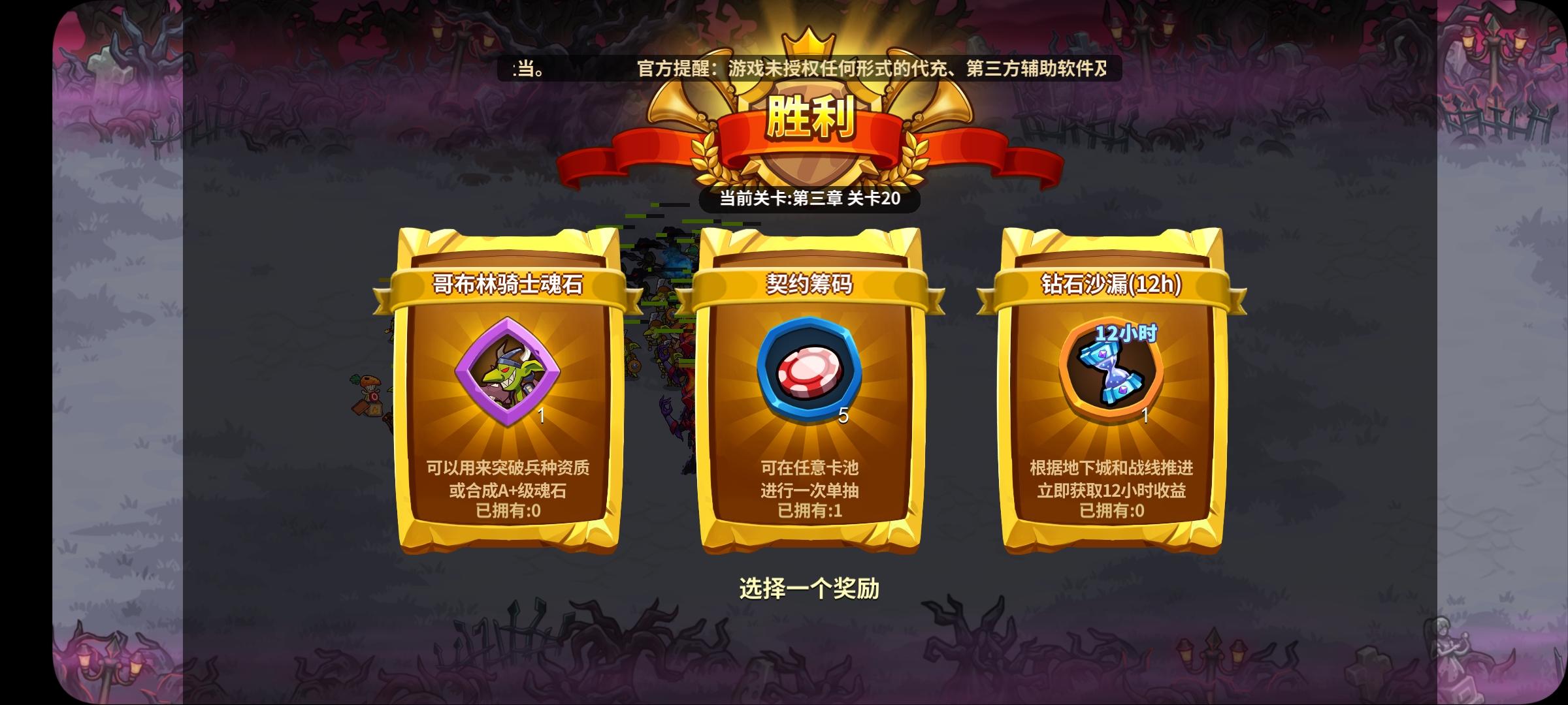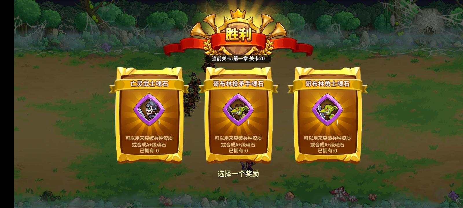 第一章跟系统走很快,第一章由于奖励固定,每一关的三选一奖励建议有瓶盖选瓶盖,没有就选主力阵容(哥布林),1-20建议选哥布林勇士的紫色魂石。