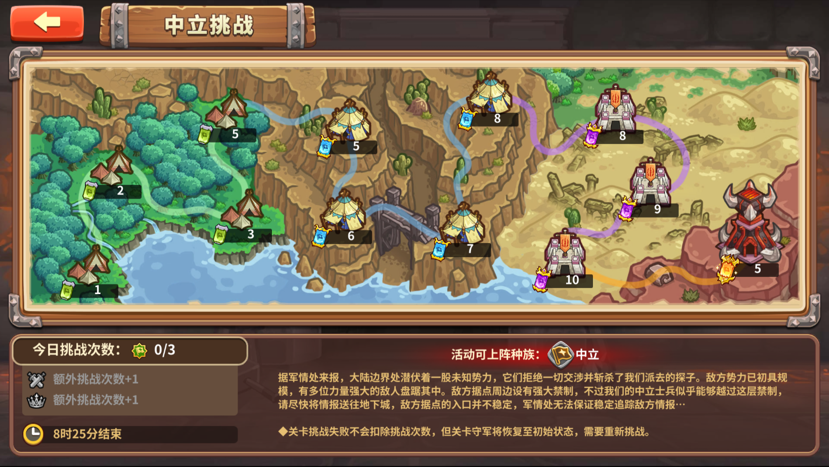 5、中立挑战:每周末限时挑战,参考前面的中立军团培养指南去选择自己的关卡,尽量一次通关最划算,中级军团来源单一,需要极大的资源倾斜,在第八章以后在进行培养,个人认为细水长流吧