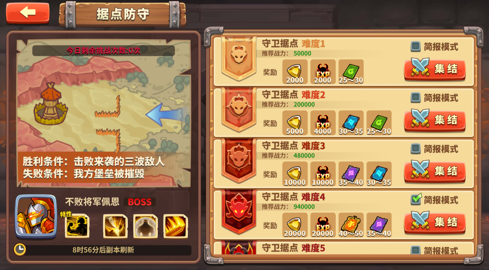 据点防守需要特别注意,这是进阶材料的来源而且次数有限,为了所有军团的进阶顺利,一般打得的是难度2和难度4。有打不过的可以参考下面的攻略