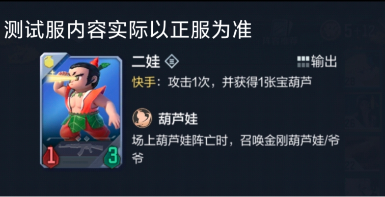 二娃是输出带“快手”技能的战士,额外攻击1次+拿1张宝葫芦,是全队的“资源永动机”。二星后单次拿2张宝葫芦,能让阵容成型速度翻倍。