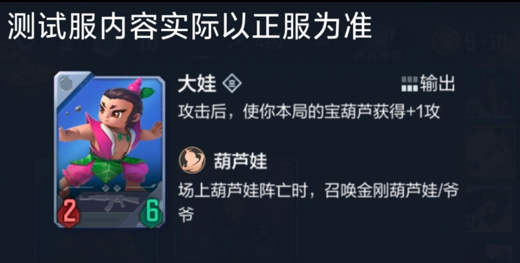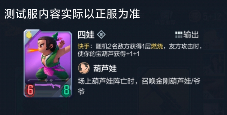 大娃是输出的前排战士,攻击后给宝葫芦+1攻,是阵容的“攻击力发动机”。站前排承伤的同时,每轮攻击都能叠高宝葫芦属性,适合前期养牌。