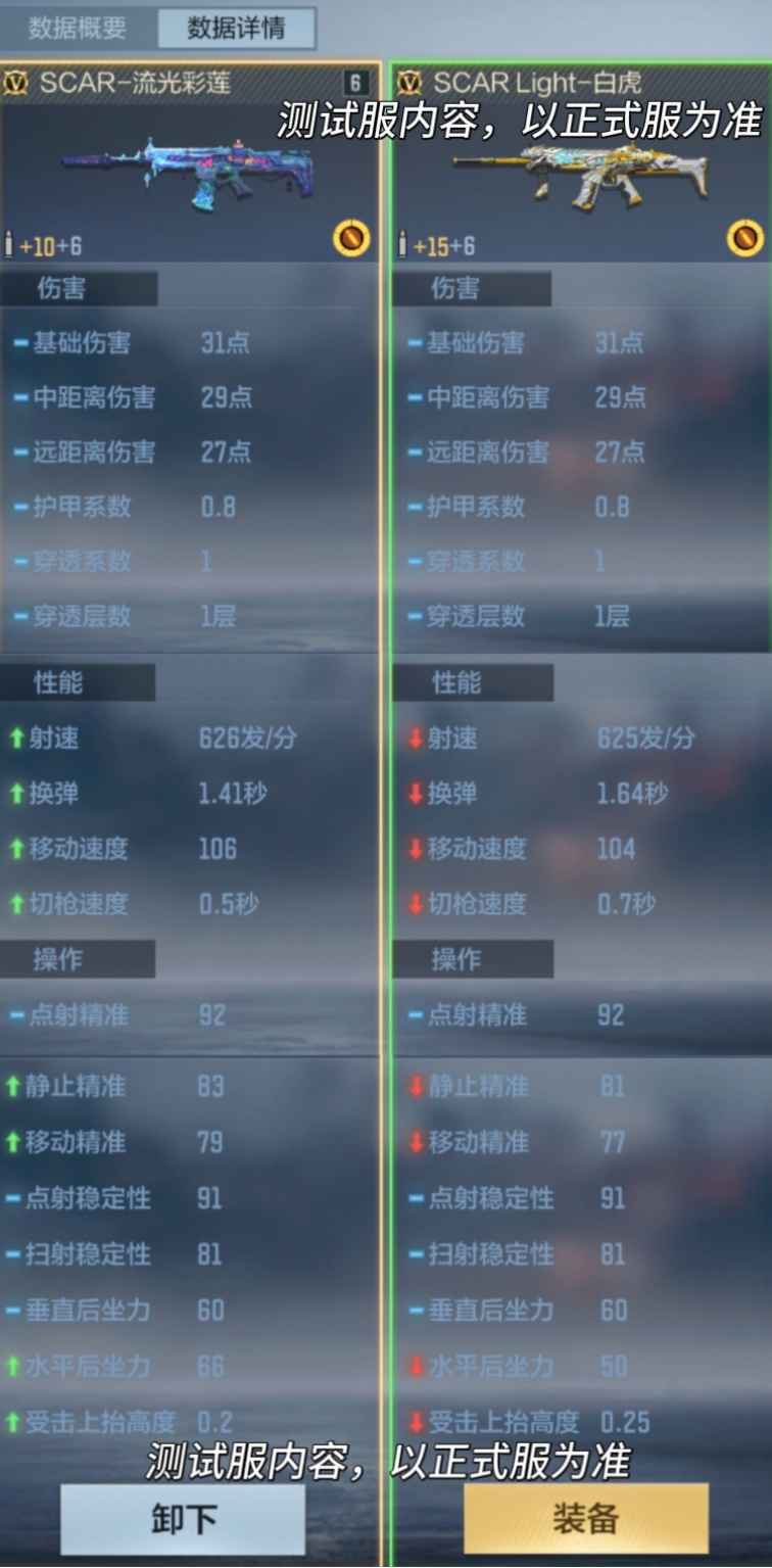 我们将SCAR-流光彩莲与SCAR Light-白虎进行对比,可以看到伤害方面两把武器持平,但无论是性能上还是操作上SCAR-流光彩莲都要略优于SCAR Light-白虎,最强SCAR武器或将易主。