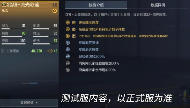 同时SCAR-流光彩莲作为葫芦小金刚联动武器,与葫芦娃系列武器也有技能联动。七力齐心技能是同背包装备的葫芦娃系列武器越多,该武器的瞄准速度越快。