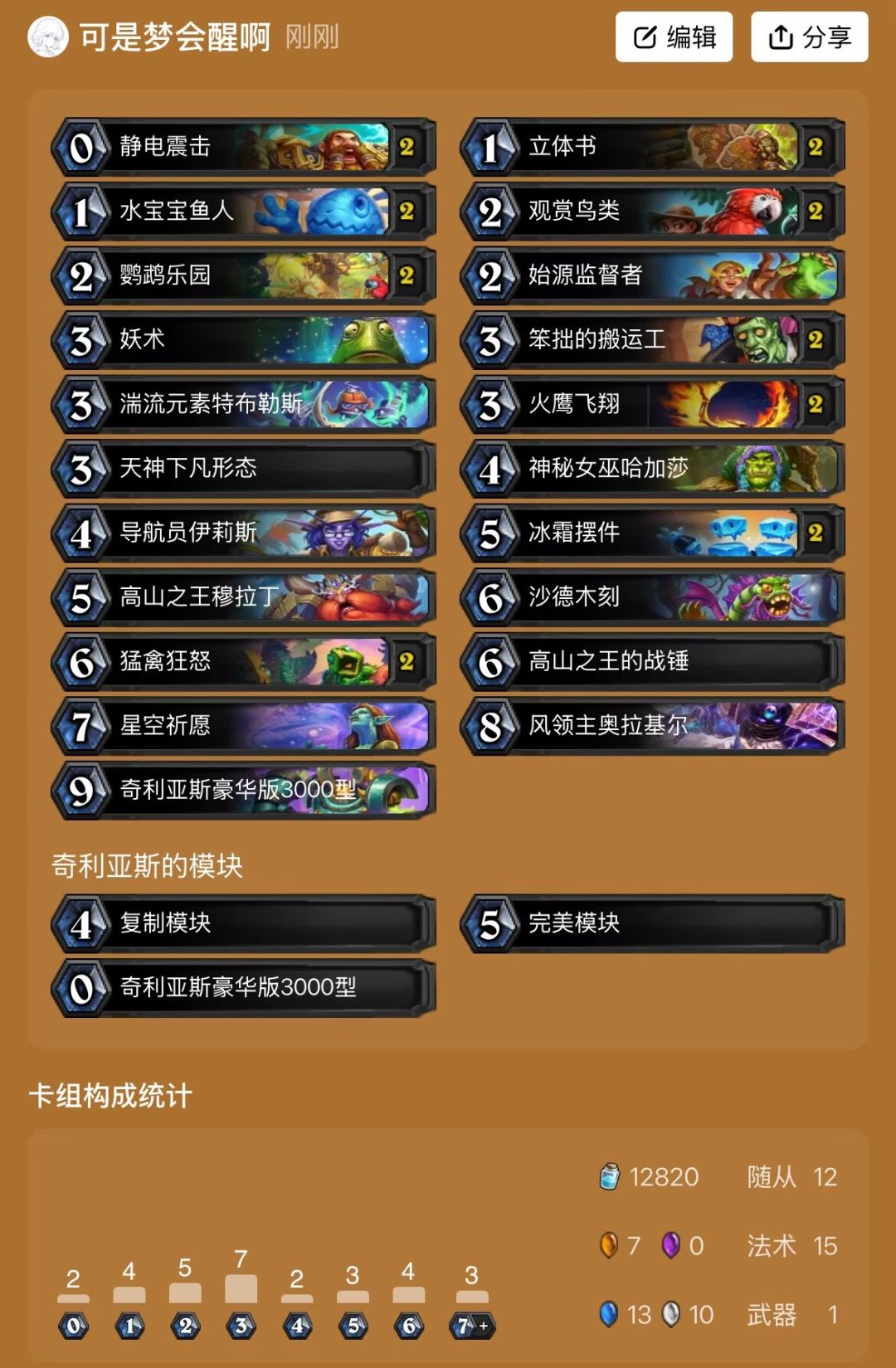 卡组代码:AAECAfe5AgyvnwSAoATHpAaopQbUpQaBuAat4QaCmAfbpgffpgflpgf1rAcJqKcGw74GhL8GzsAG0MAG2cAG0dAG5pYHvLEHAAED9bMGx6QG97MGx6QG7t4Gx6QGAAA=这套卡组应该是一套比较大脑按摩的卡组。主要思路就是利用高身材随从持续给出压力。节奏点:三费:【火鹰飞翔】过到【搬运工】可以给到10-20伤害的压力中期:依靠【哈加沙】过到【祈愿】配合地标提前启动或者配合【沙德沃克】三倍战吼。【猛禽狂怒】可以过墙补伤害也可以白嫖对面随从换场面【奇闻刀】和【奥拉基尔】可以用来补伤害。【伊莉斯】地标建议找法术和复制,萨满法术有概率可以找到【星云】和【祈愿】优势:操作性比较低,基本上按费牌怪找节奏压场面就可以赢。劣势:主要依靠随从场面,如果碰到战士等解场能力较强的职业比较劣势其次就是解场返场能力比较弱,内战或者遇到卡手情况就会被滚雪球滚死。构筑思路:我这套构筑是根据环境所改的。可以换掉一张【静电震击】换成【星空祈愿】【始源监督者】可以换成【活体烈焰】稳定抽火鹰飞翔【妖术】如果环境中精魂瞎、星灵牧或者奇闻DK比较少的话也可以换掉精魂瞎