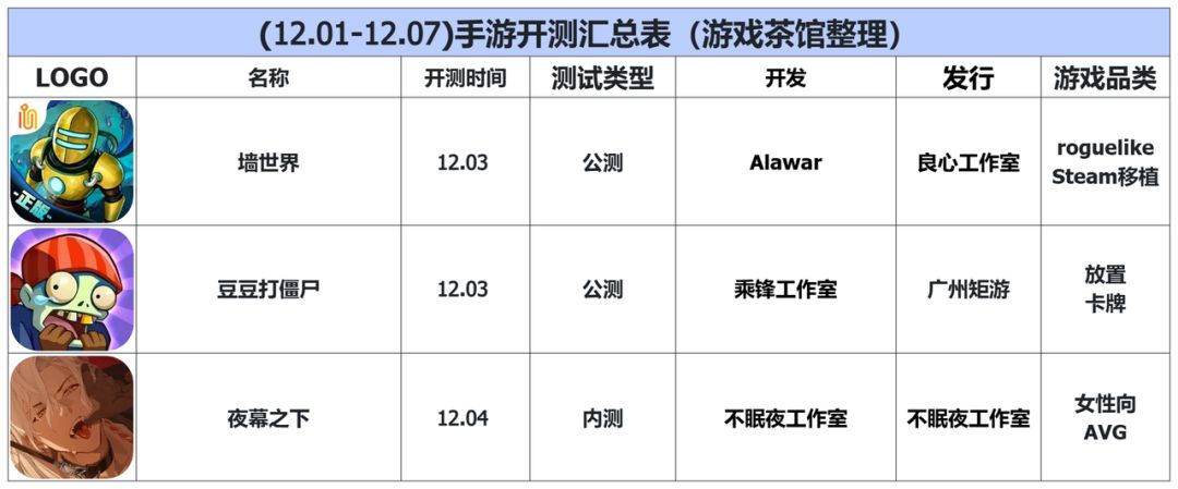 游戏茶馆整理了本周内(12.01-12.07)即将上线的新游戏。