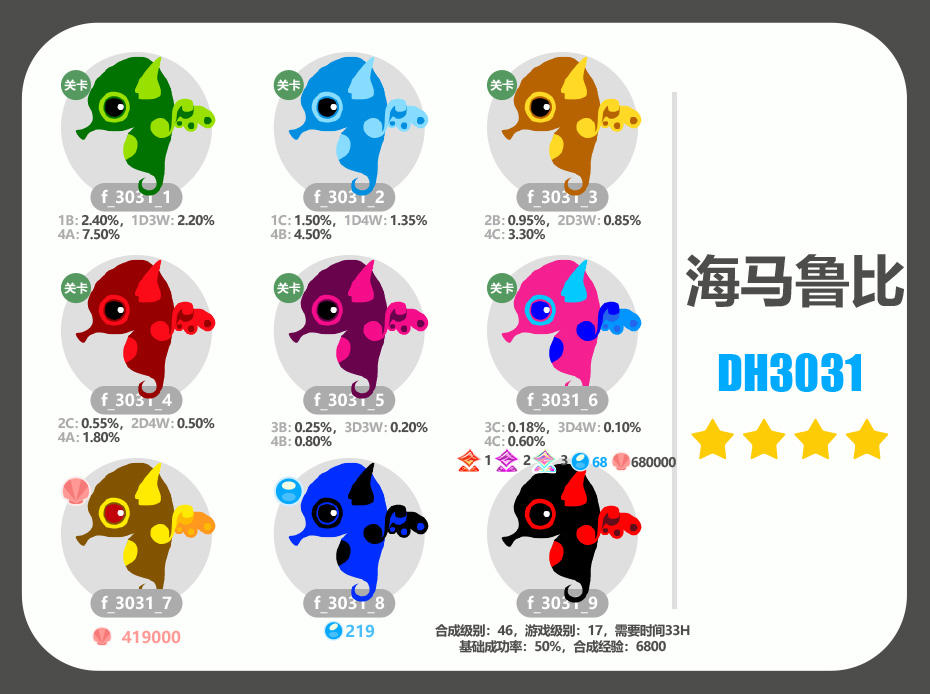 海马鲁比是豆花族4星鱼,一共9种颜色,其中前6色出处在关卡,第7色是贝壳鱼,第 8色是珍珠鱼,第9色是合成鱼。活动时间为2025年12月1日至2025年12月16日,更新时间为2025年12月1日中午1点左右(更新时间以实际情况为准),更新后会重置捉鱼次数。