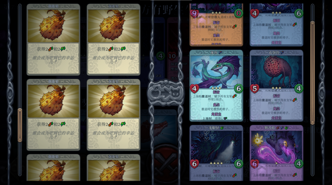 通过事件中的金银甲虫,能让部分比较弱鸡的怪物“进化”,从身材到技能强度都狂增猛增劲增。要是觉得中间的过渡牌强度不是很满意,那就带着初始怪战个未来吧。