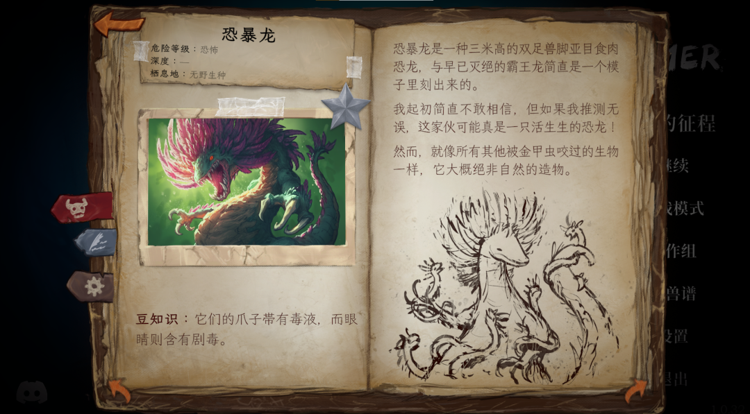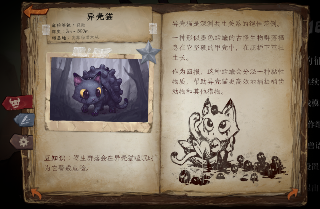 它没有传统的线性剧情,而是把几乎所有叙事内容都放进了图鉴里。主角作为生物学家,会在探险过程中记录每一种怪物,从背景描述到手绘素描,再到现场照片拼贴,让图鉴更像一本科研日志,而不是一个给出参考数值的攻略本。