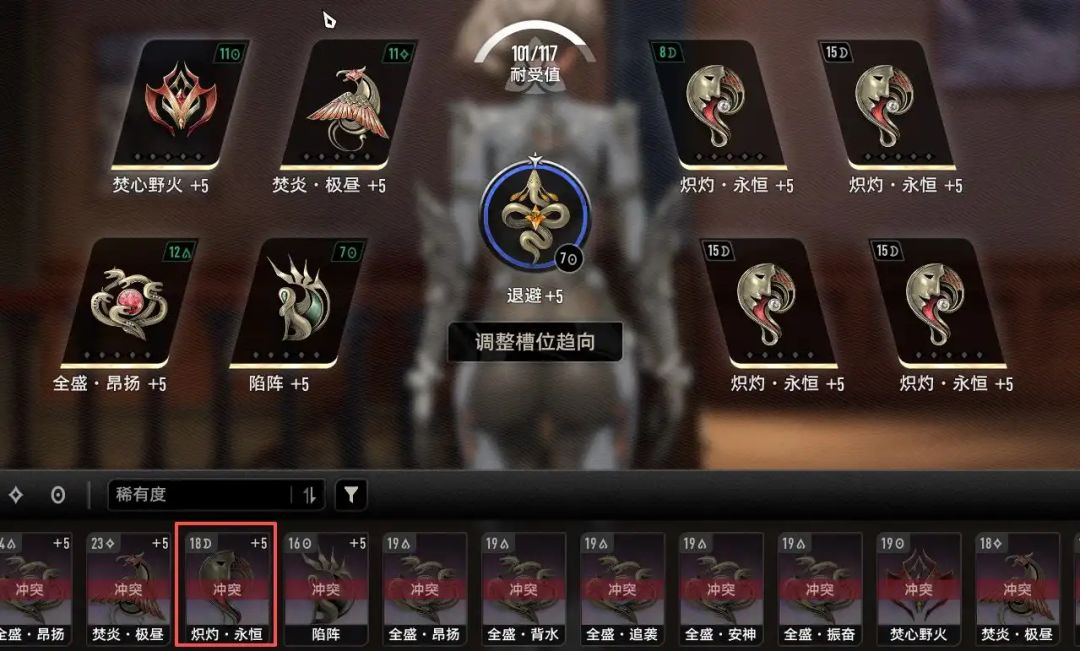 在改变趋向的装备格上安装魔之楔的话,如果趋向相同则消耗耐受值减半,不同则会增加25%(小数点向上取整)。后期的紫色和金色魔之楔可能会出现20+甚至30+的耐受值,这时候改变趋向就是必须的了,不然上限必然不够。