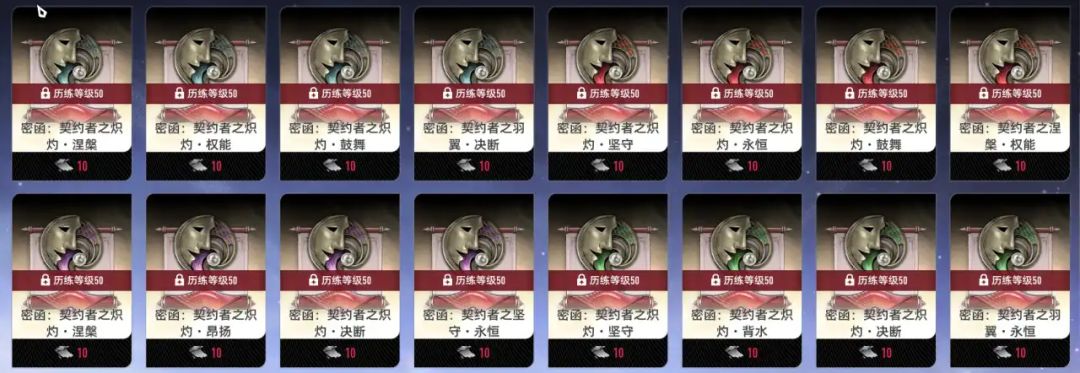50级解锁契约者套的兑换,但是一定要注意的问题在于金色的契约者+5和紫色的契约者+5提供的属性是一样的,仅仅是耐受值更低;因此强烈不建议刷非主C的金色契约者套。金色版本的意义在于可以通过增幅达到更高的数值,但是需要消耗同品质的同名魔之楔,根据增幅等级消耗的数量也会提升,5次需要的数量分别为1,1,2,2,3个也就是说你要毕业一个金色的魔之楔需要做10个一样的,1个本体9个增幅材料。