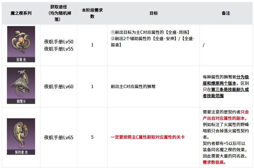 基础的魔之楔出产自夜航手册,后期合成金魔之楔需要的紫色品质魔之楔也主要出自于此。个人建议是把委托手册尽量留给夜航手册,可以大幅降低刷取的难度(会直接增加魔之楔掉落数量)大约在你角色上限卡到60级时,就需要大量在夜航手册里刷魔之楔了,建议多留一些委托手册给这个阶段。比较关键的契约者套则是根据不同输出产出自对应属性的本,比如:副本标的属性是火,就只会产出火属性的契约者,因此一定要刷自己主C对应属性的副本。