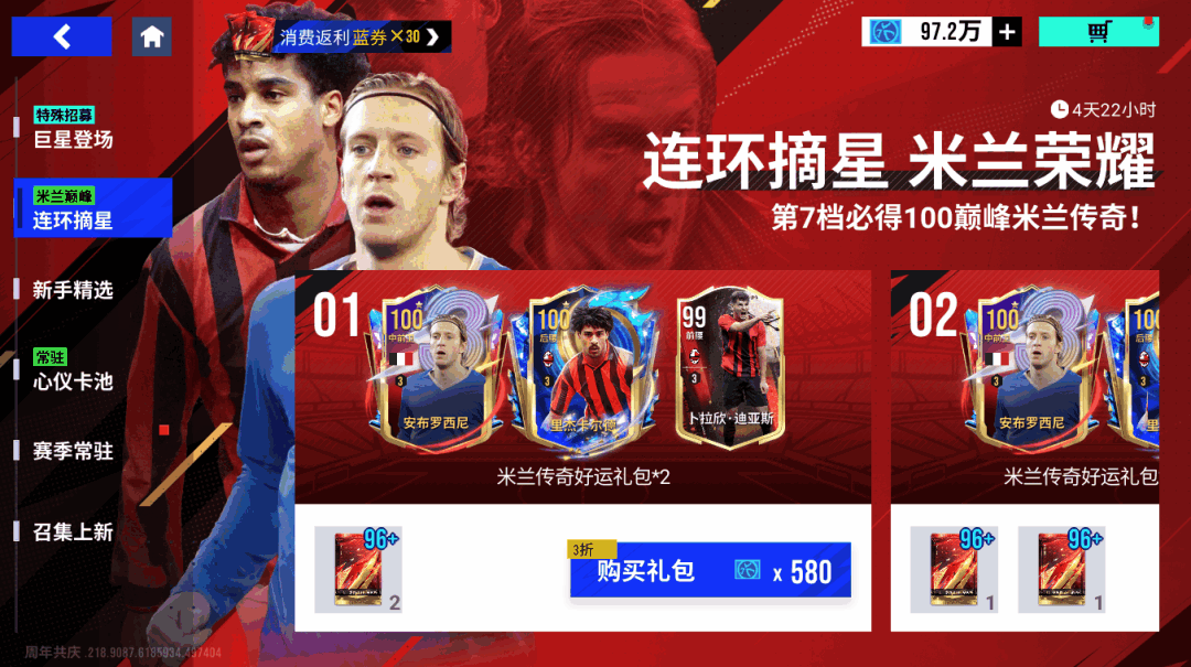 12月1日11时-12月8日11时期间,通过参与活动购买连锁礼包,有机会获取100潜力值巅峰里杰卡尔德、100潜力值巅峰安布罗西尼!