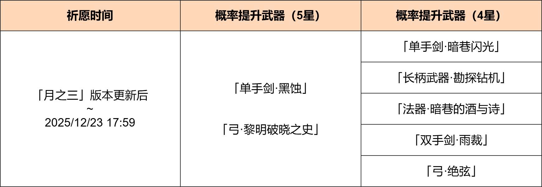 ●活动期间,可使用「神铸定轨」对本期5星UP武器「单手剑·黑蚀」或「弓·黎明破晓之史」进行定轨,更多「神铸定轨」详细规则可点击祈愿界面左下角【详情】按钮进行查询。