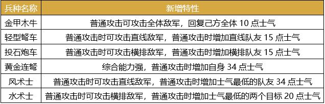 2、三阶兵种调整:这部分涉及多个兵种的属性调整,具体数值较多,暂不一一列举了,以下是几个重点新增特性的兵种调整: