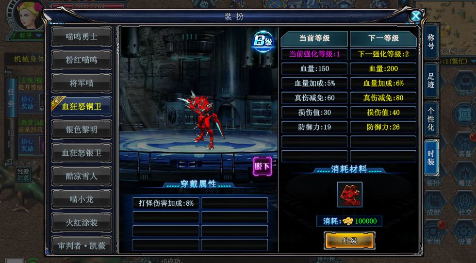 在面对不同的情况下,玩家可自由切换时装以获取最大利益,例如在刷怪时可选择血狂怒铜卫,可以增加打怪的伤害。