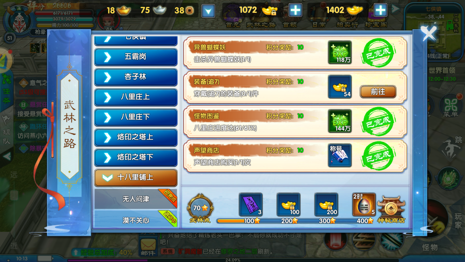 二、升级路径:高效冲级不绕路,日常玩法有深度1. 核心升级逻辑1-17 级紧跟主线任务,完成 “武林之路” 可直接斩获蓝色 BT 武器与海量绑元,快速渡过新手期;20 级后解锁多元日常,每日 10 环跑环、武林悬赏(优先接至尊 / 神级任务)是经验核心来源,搭配每日 12:00-14:00、18:00-20:00 的双倍经验时段,效率翻倍。尤其推荐每日 18:30-19:00 的帮派传功,6 人满队挂机 30 分钟,经验收益堪比 3 小时野外刷怪,还能积累帮贡兑换稀有材料。