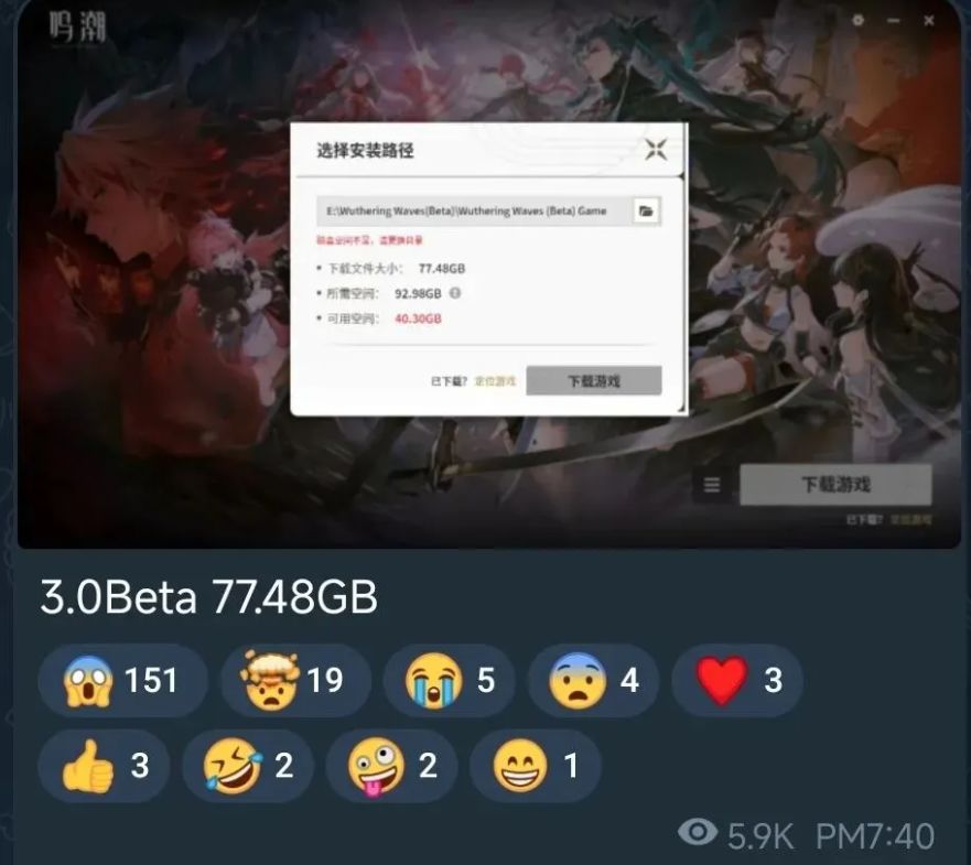 《鸣潮》3.0 PC包体大小已放出,高达78G!