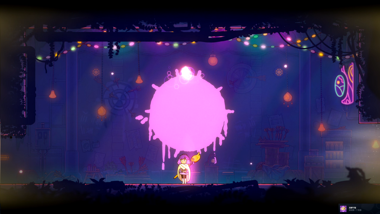 最后,为玩家提供养成空间的部分便是本作的灵感系统了。通过探索收集不同区域的奖励节点,玩家就可以迸发出不同类型的灵感拼图,它类似拼图格子的被动构筑机制,玩家可以借此做出自己的 Build,提升自己的战斗能力,或解锁额外的移动、跑酷机制。此外,地图里还藏着不少奖励收集品,例如提升血量、体力上限的染料瓶,它们往往藏在需要主动破坏的隐藏墙后,跑图时没事砸砸墙或许就会有惊喜。