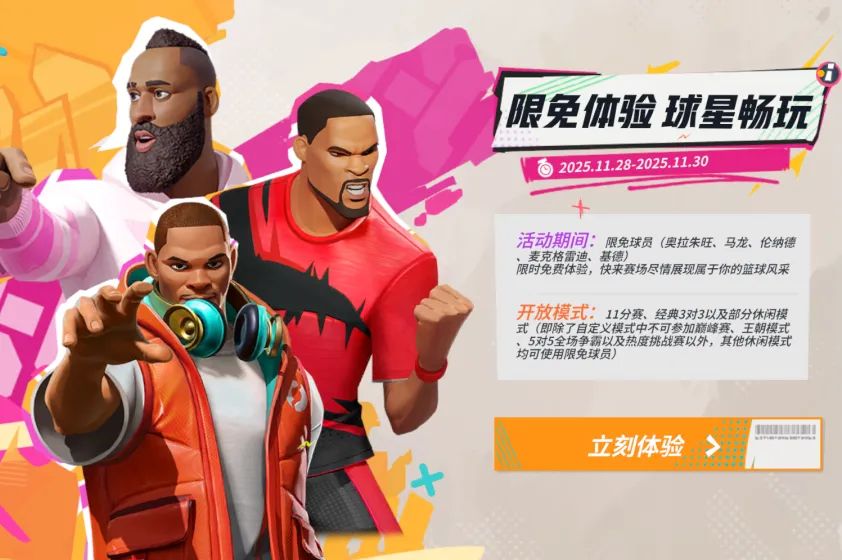 球员限免活动限时开启,连续五个周末时段,带你畅玩多位橙卡巨星!本周的球员限免活动于11月28日0点开启至11月30日24点结束。街球手们在周五、六、日期间可在特定模式中免费使用指定超级巨星。