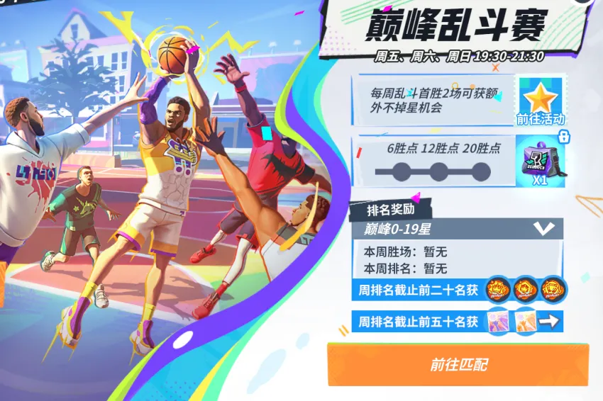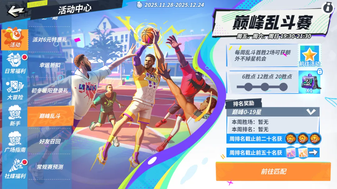 11月28日-12月24日,期间每周五、六、日19:30-21:30限时开启。参与的街球手都需要达到巅峰超巨段位,仅限单排!派对最高标准的匹配赛对决,胜负不影响巅峰赛段位,高手云集,竞技性拉满!