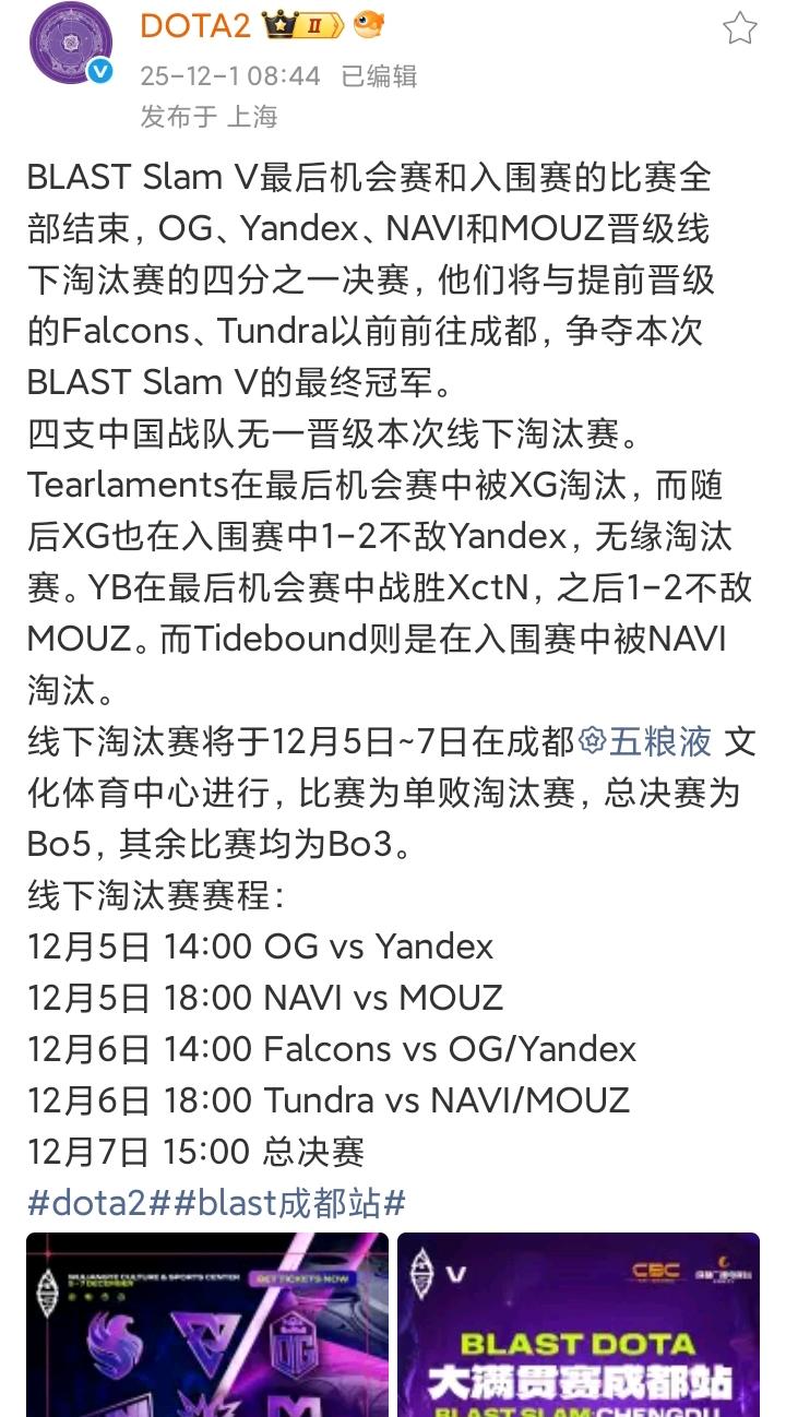 12月1号,国服DOTA2发文,在成都举办的BLAST Slam V中四支中国战队全部无缘淘汰赛😂😂😂