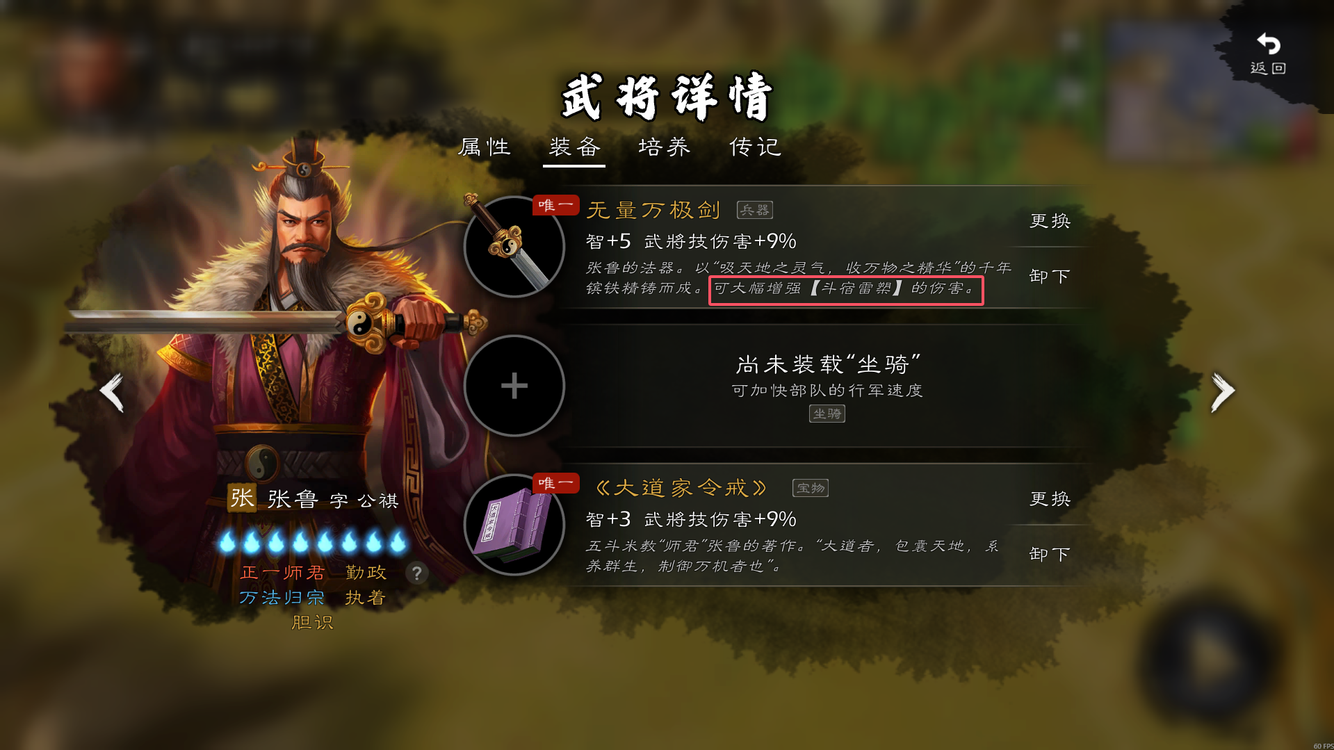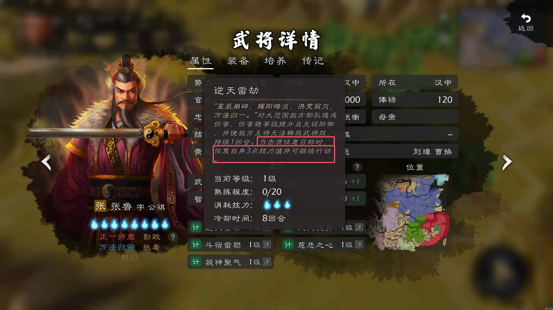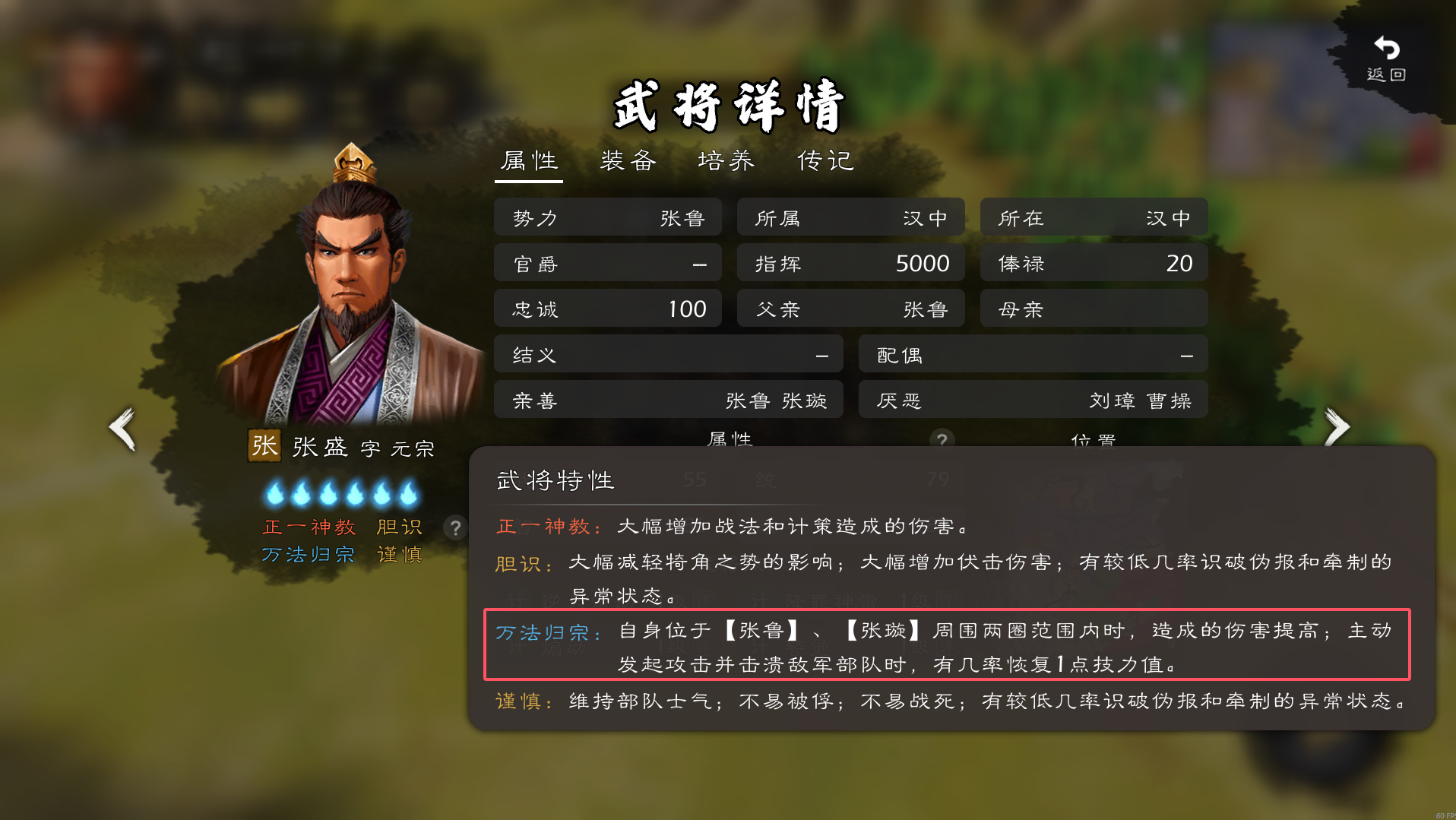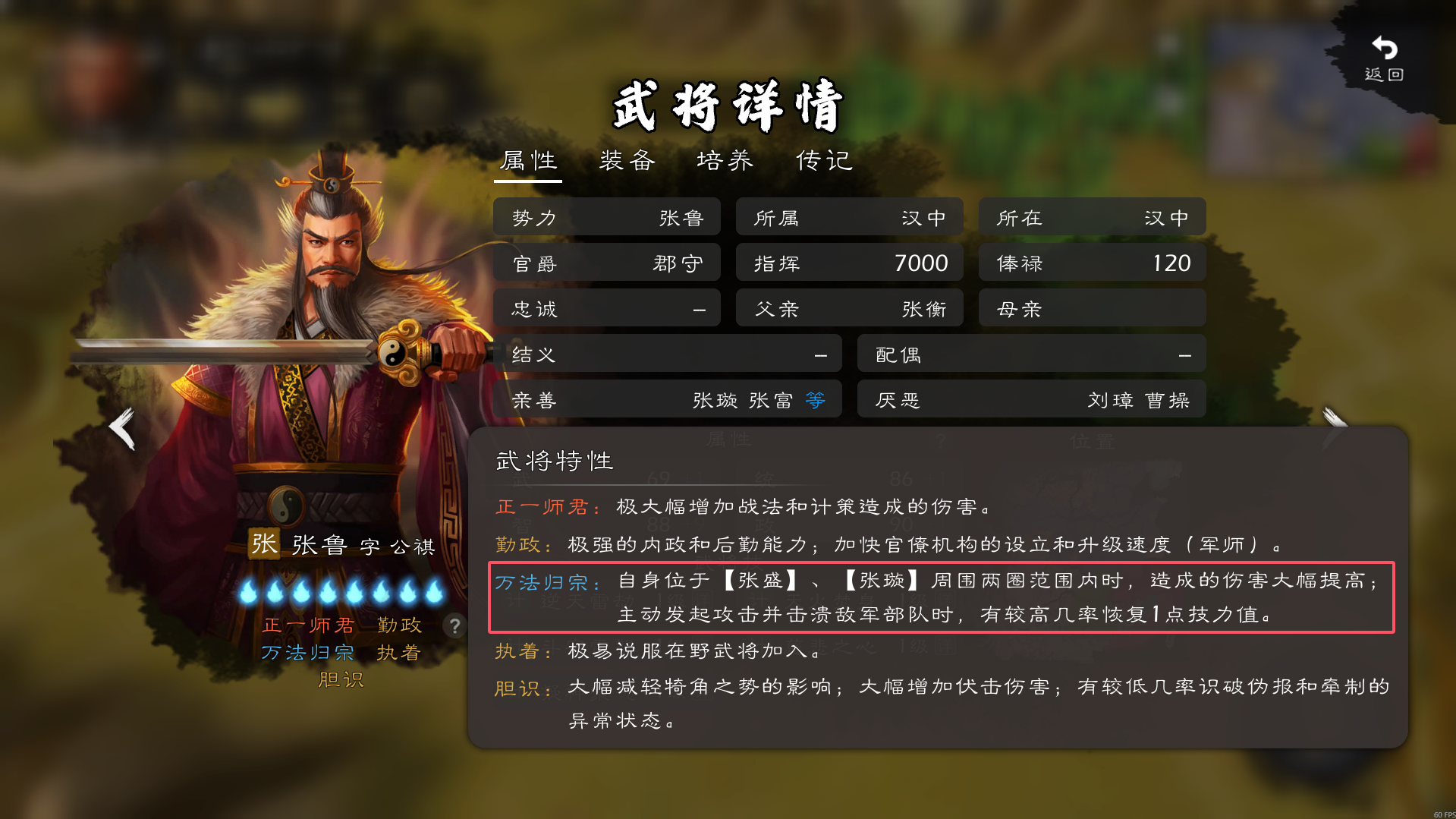 1.新特性-万法归宗(蓝):自身位于【张鲁】、【张盛】周围两圈范围内时,造成的伤害提高;主动发起攻击并击溃敌军部队时,有几率恢复1点技力值。