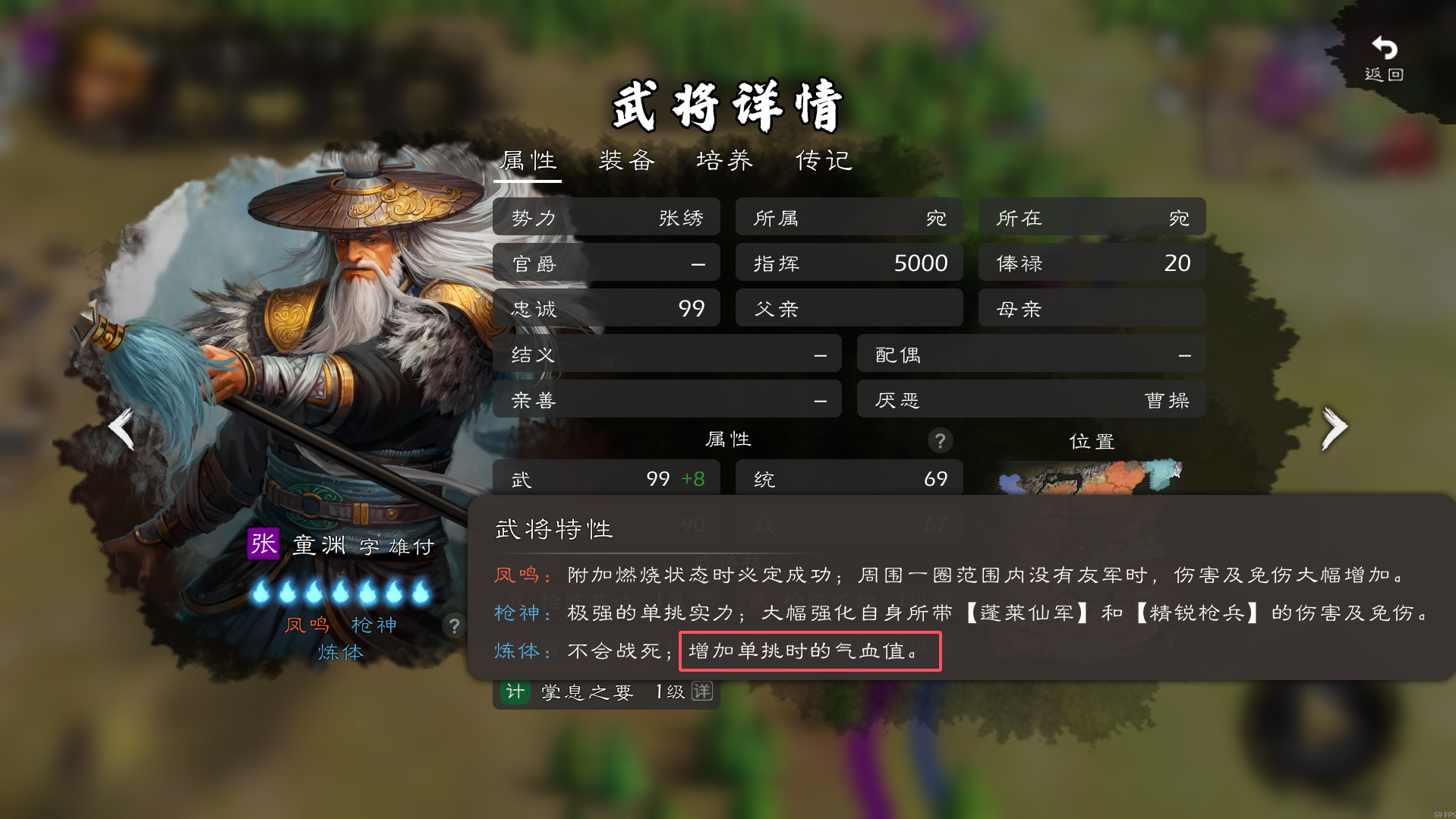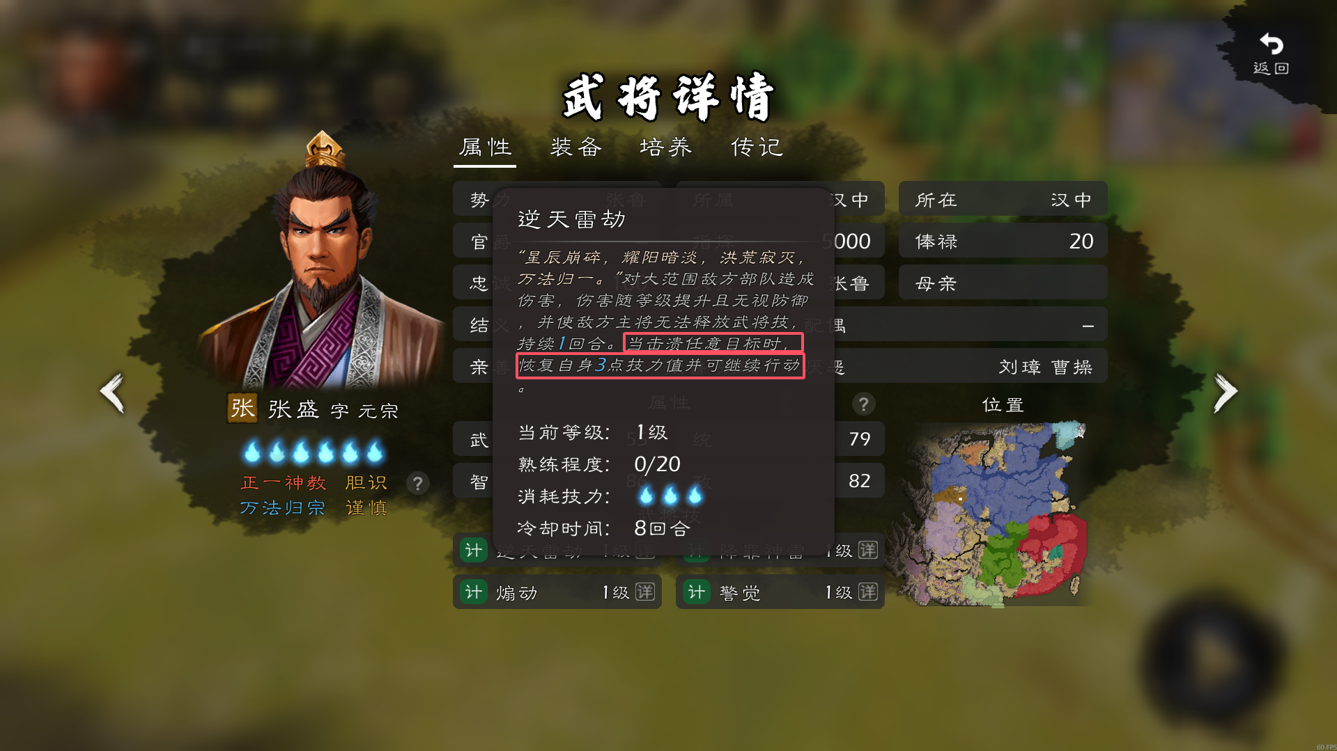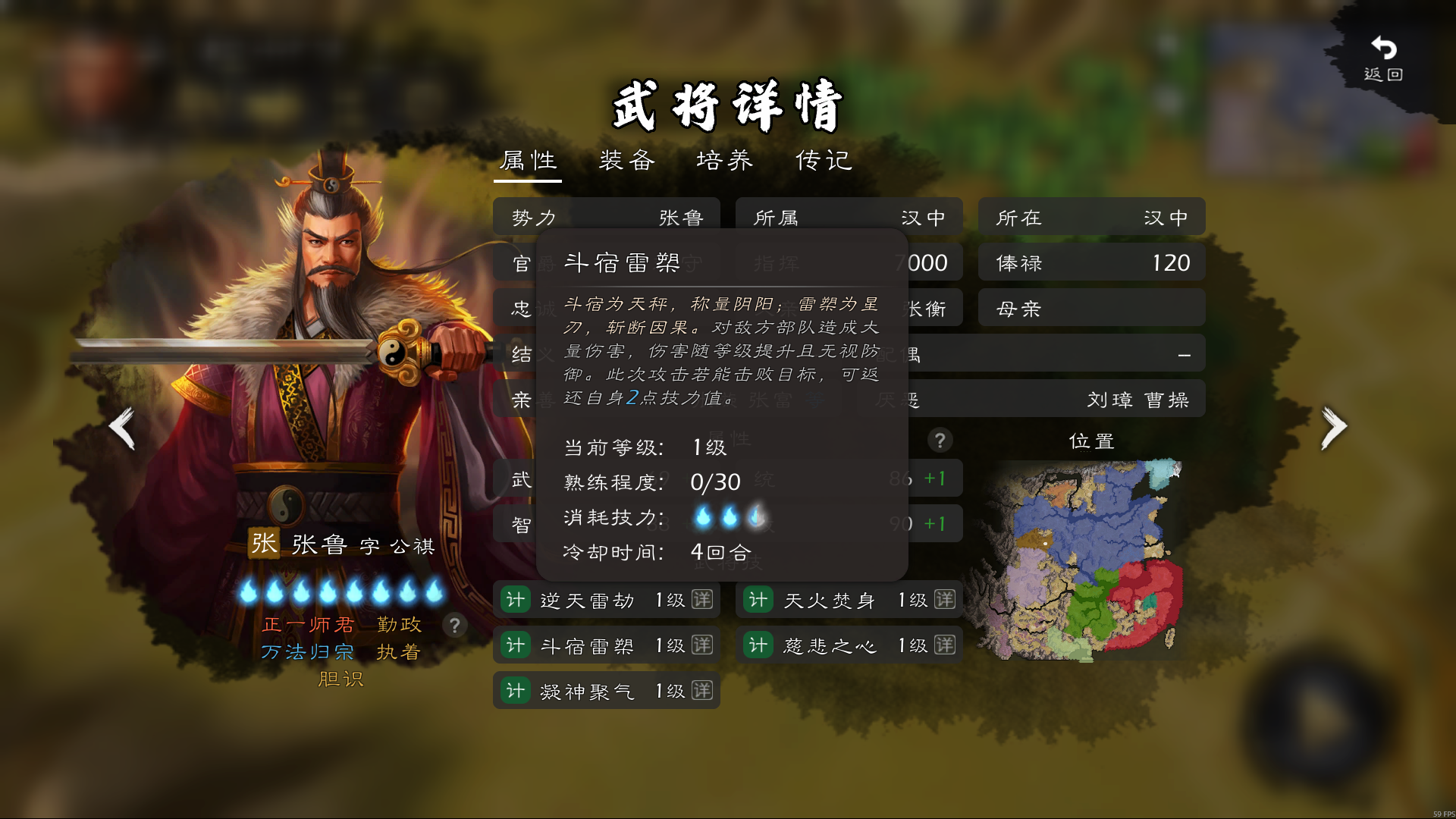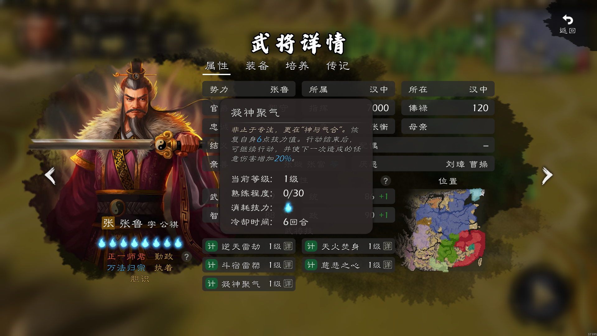 1.新特性-万法归宗(蓝):自身位于【张鲁】、【张盛】周围两圈范围内时,造成的伤害提高;主动发起攻击并击溃敌军部队时,有几率恢复1点技力值。